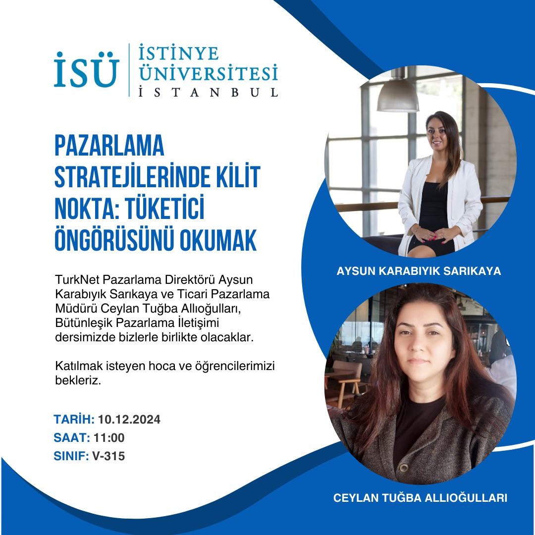10.12.2024 tarihinde 11:00'de gerçekleştirilecek olan etkinliğimiz TurkNet Pazarlama Direktörü Aysun Karabıyık Sarıkaya ve Ticari Pazarlama Müdürü Ceylan Tuğba Allıoğulları katılımıyla gerçekleştirilecektir.