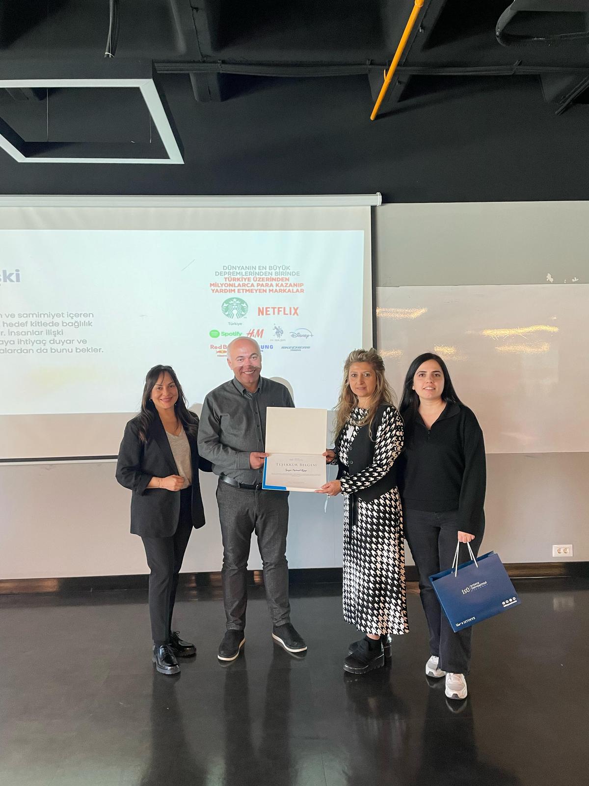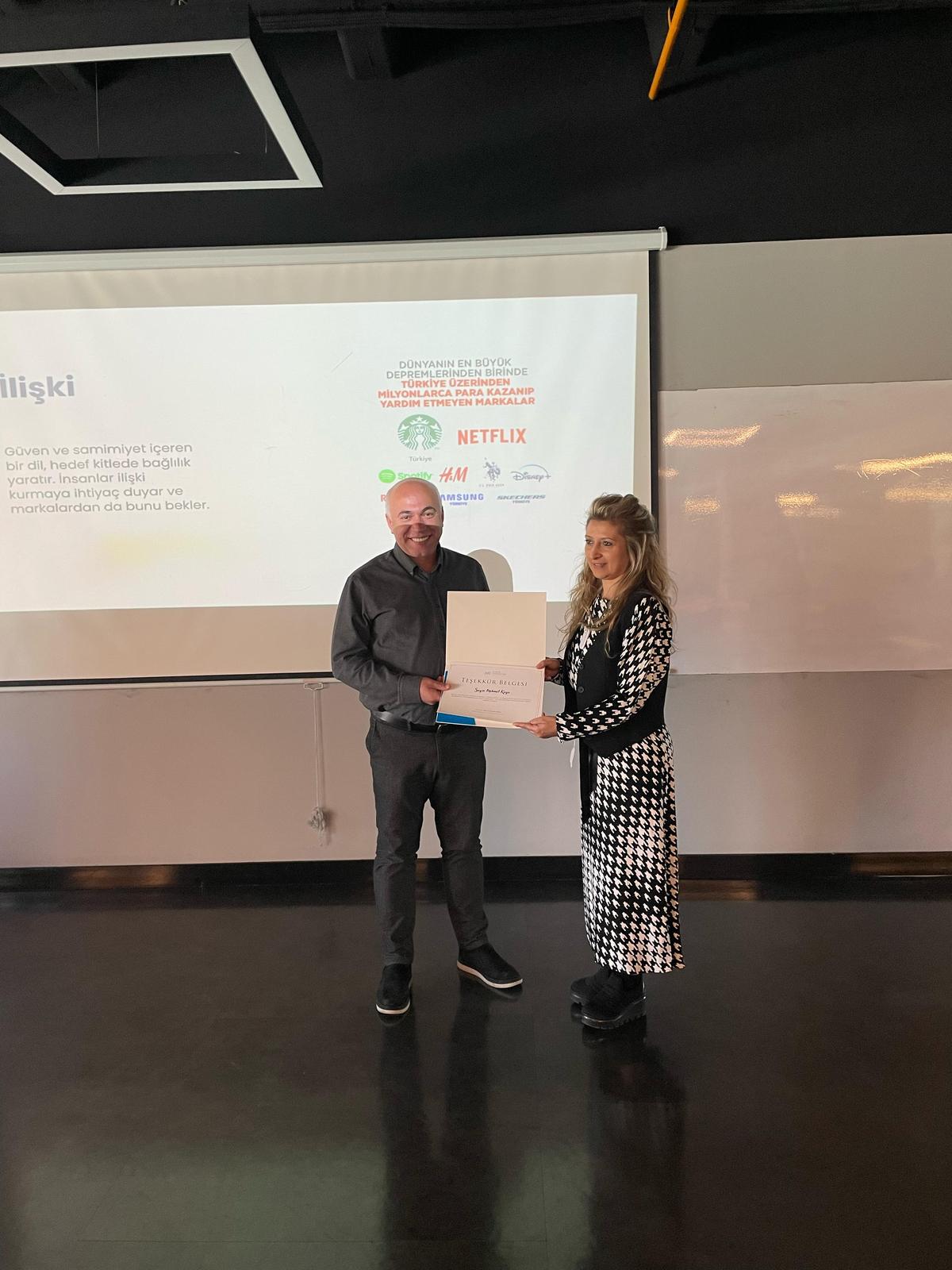 Etkinliğin sonunda, Halkla İlişkiler ve Reklamcılık Bölümü Başkanı Prof. Dr. Ruken Özgül Kılanç ve Nöropazarlama Danışmanı ve Nöro Akademi Kurucu Ortağı Serra Uslu tarafından Mehmet Kaya’ya teşekkür belgesi takdim edildi.