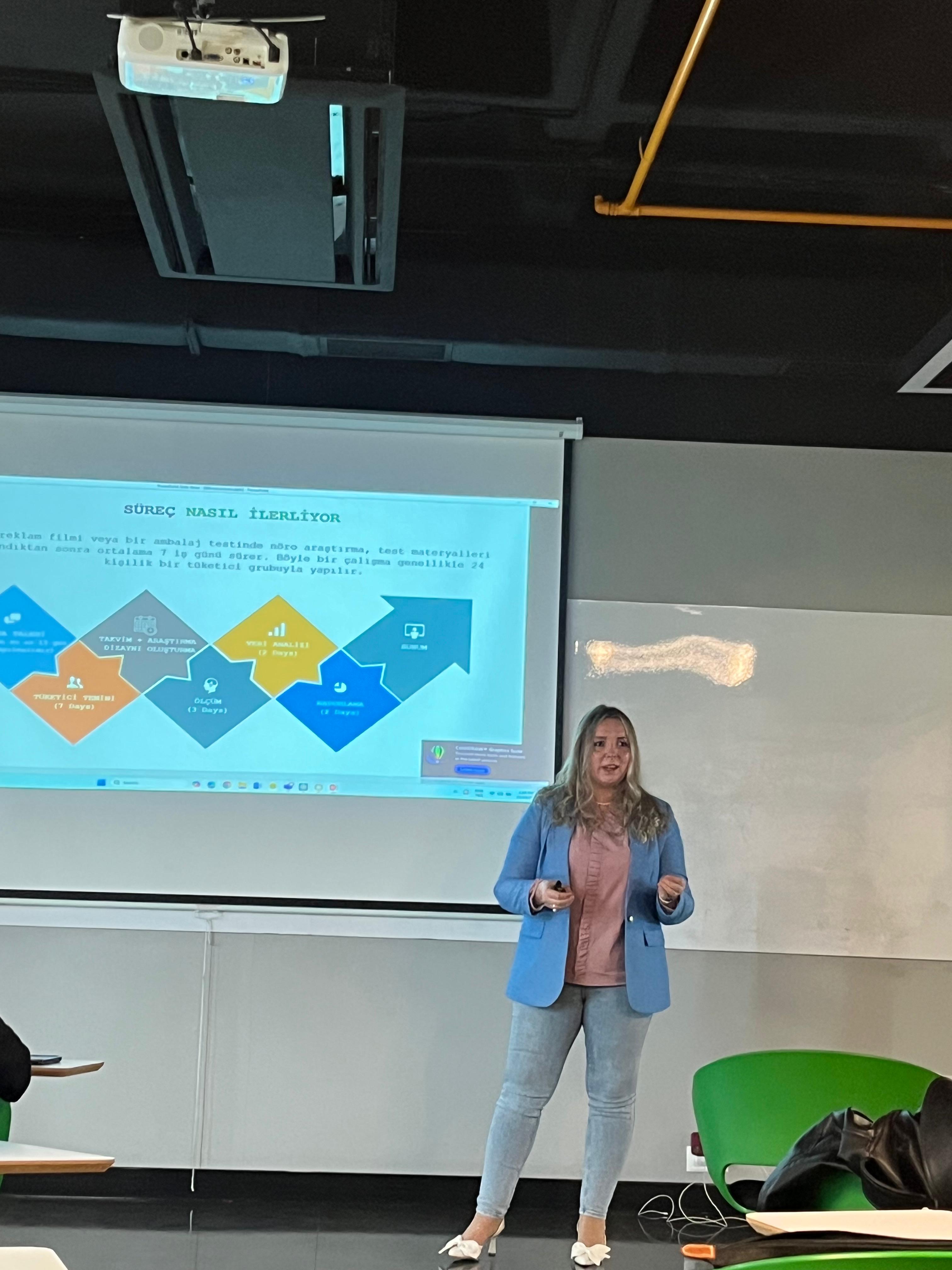 Dizar, nöropazarlamada kullanılan ölçüm tekniklerine de sunumlarında yer verdi. Elektroensefalografi (EEG) ve göz izleme teknolojileri gibi araçların, reklamların etkinliğini analiz etmede nasıl kullanıldığı anlatıldı ve söyleşide ölçüm cihazlarıyla öğrencilerle workshop yapıldı.