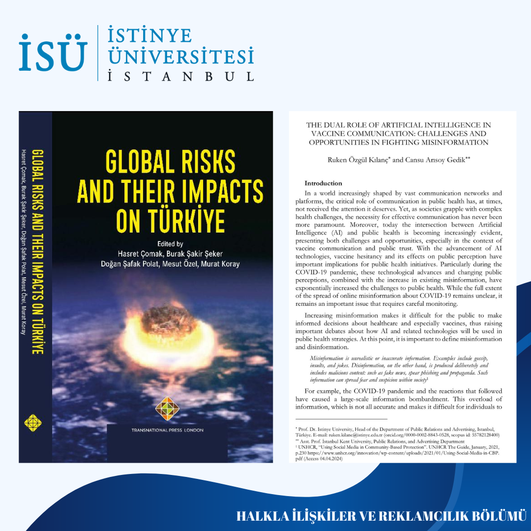 İletişim Fakültesi Halkla İlişkiler ve Reklamcılık Bölümü Bölüm Başkanı Prof. Dr. Ruken ÖZGÜL KILANÇ hocamızın bölüm yazarı olarak yer aldığı Global Risks and Their Impacts on Türkiye başlıklı kitap yayınlandı. Hocamız “The Dual Role of Artificial Intelligence in Vaccine Communication: Challenges and Opportunities in Fighting Misinformation” başlıklı bölümü kaleme aldı. Hocamızı ve emeği geçen herkesi tebrik ederiz.