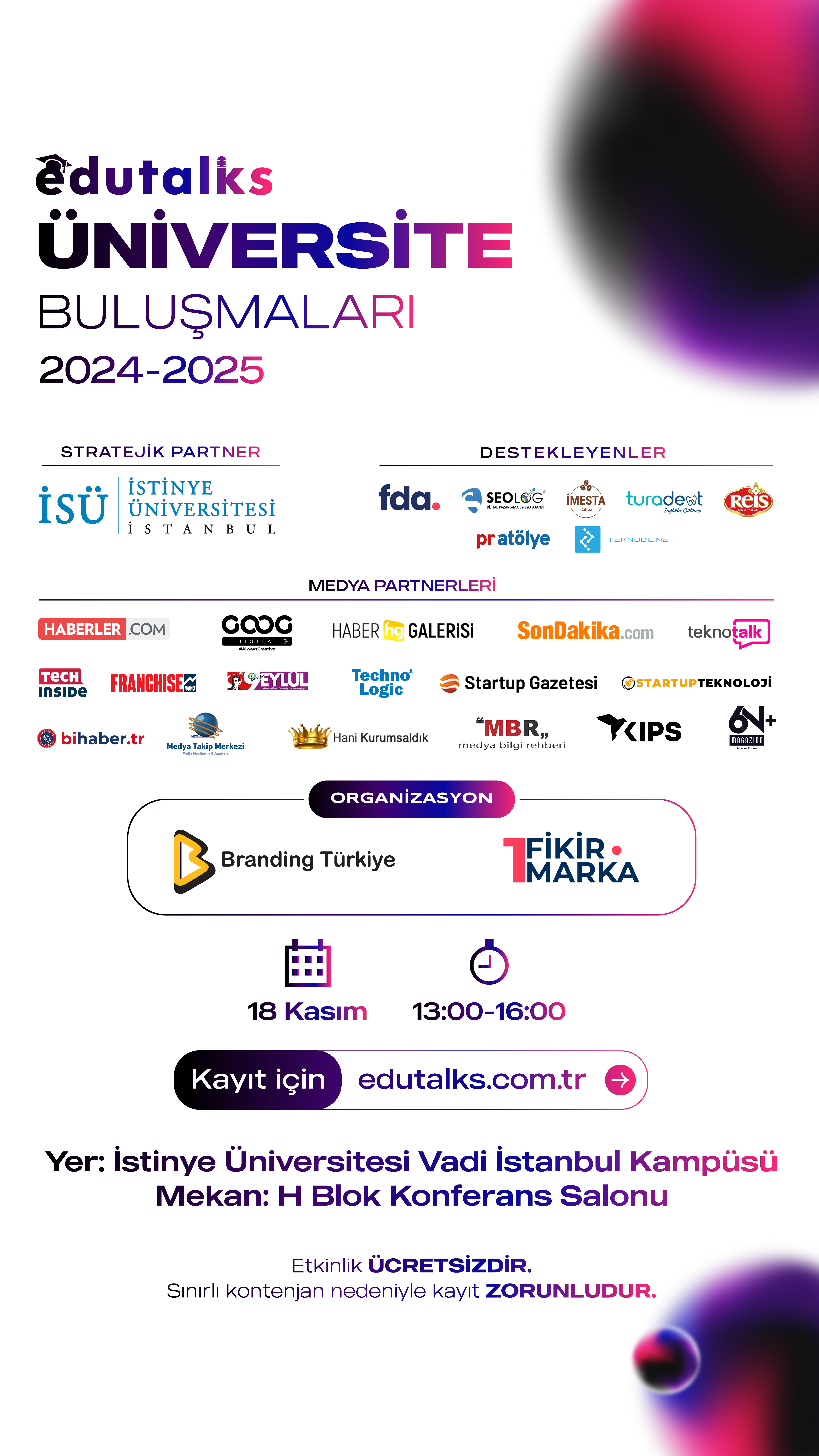 İstinye Üniversitesi, İletişim Fakültesi tarafından 18 Kasım 2024 tarihinde saat 13.00'de Vadi H Yerleşke Konferans Salonu'nda gerçekleştirilecek olan EduTalks Üniversite Buluşmaları etkinliğine davetlisiniz.