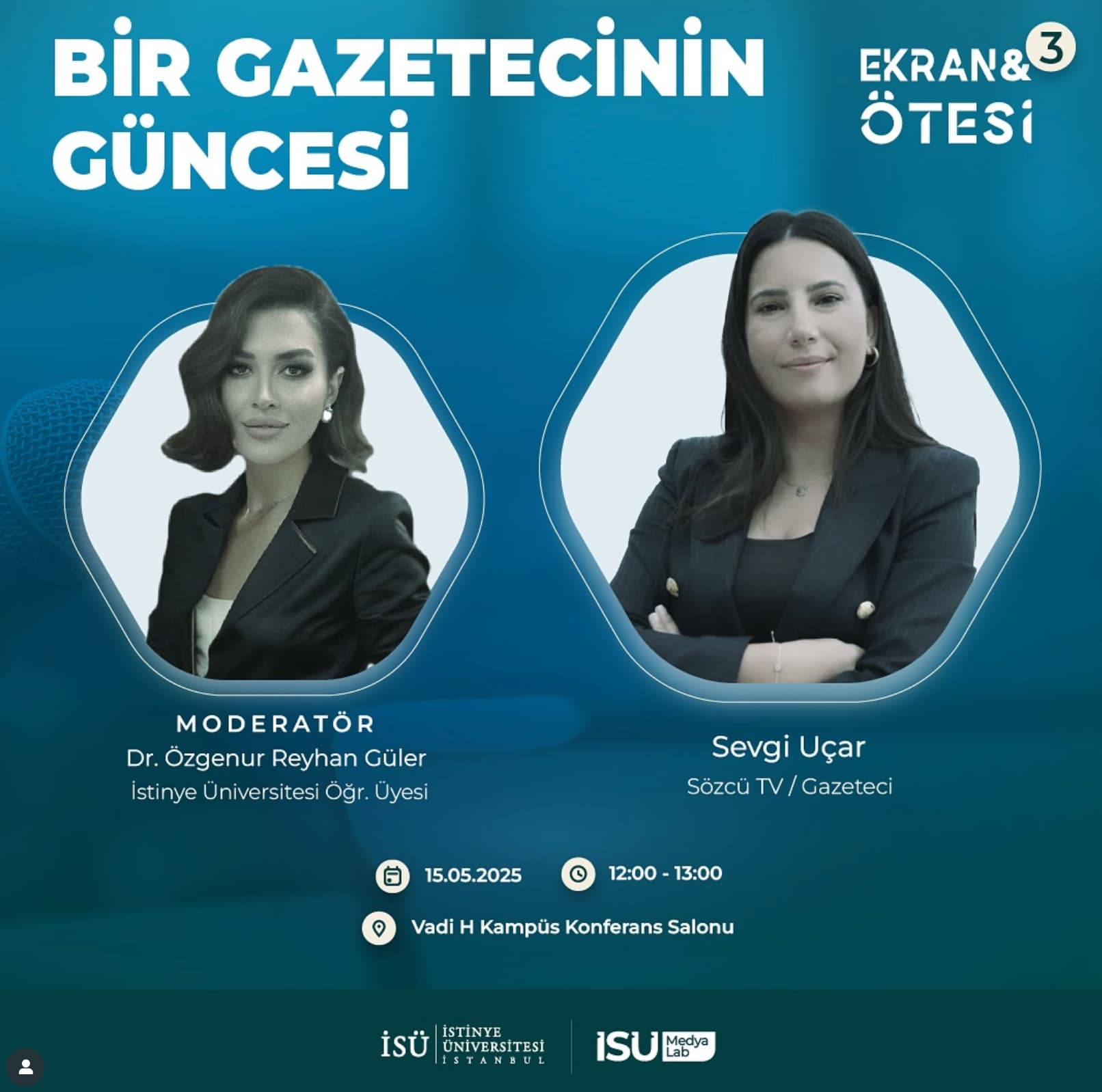 İstinye Üniversitesi İletişim Fakültesi Medya Lab tarafından düzenlenen “Ekran & Ötesi” söyleşi serisinin üçüncüsü, 15 Mayıs 2025 tarihinde Vadi H Kampüs Konferans Salonu’nda gerçekleştirildi. “Bir Gazetecinin Güncesi” başlıklı etkinlikte, Sözcü TV’nin başarılı gazetecisi Sevgi Uçar konuk edildi.