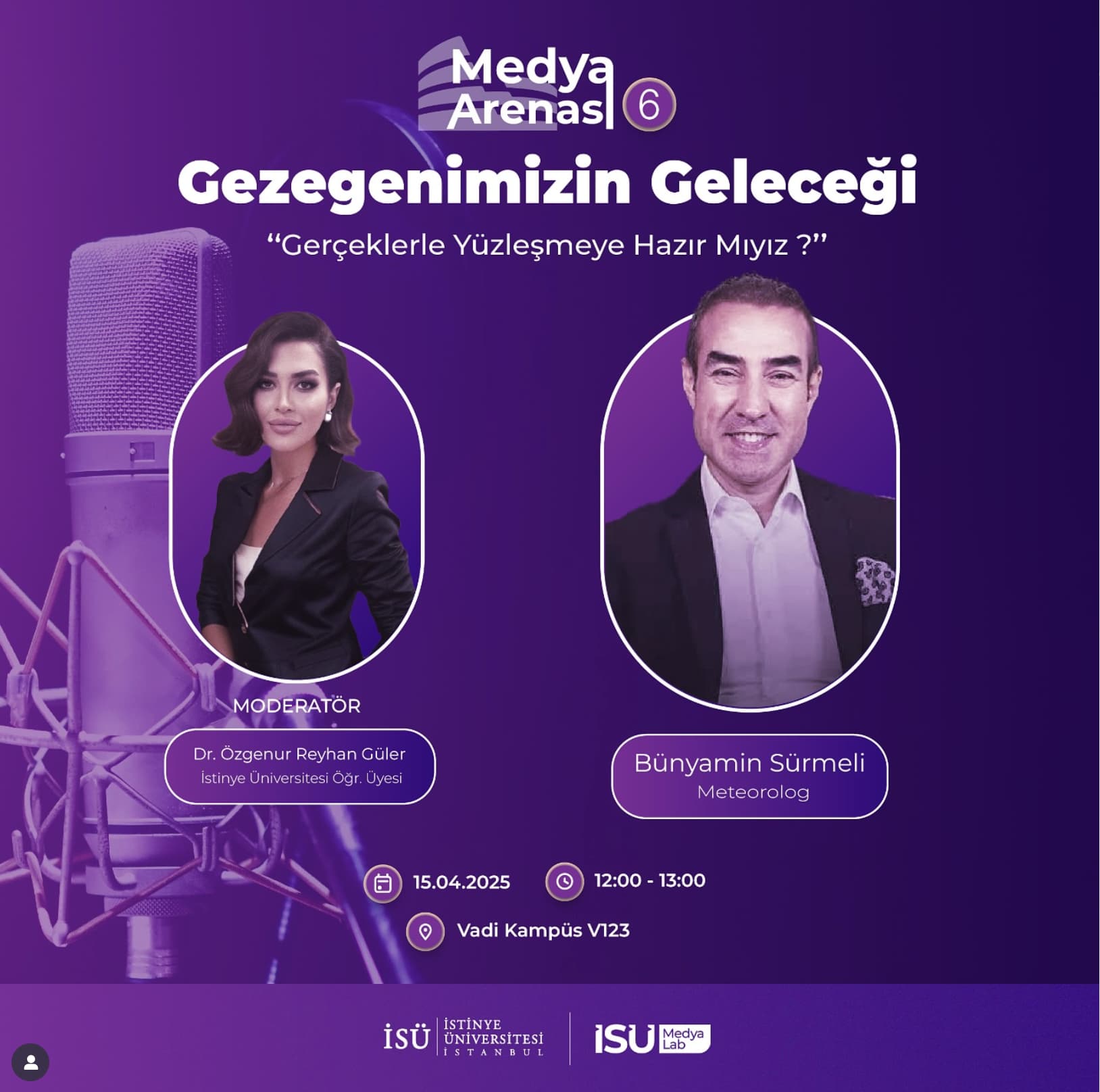 İstinye Üniversitesi Medya Merkezi tarafından düzenlenen “Medya Arenası” söyleşi serisinin altıncısı, 15 Nisan 2025 tarihinde Vadi Kampüs’te gerçekleştirildi. “Gezegenimizin Geleceği: Gerçeklerle Yüzleşmeye Hazır Mıyız?” başlıklı etkinliğe meteoroloji uzmanı Bünyamin Sürmeli konuk oldu.