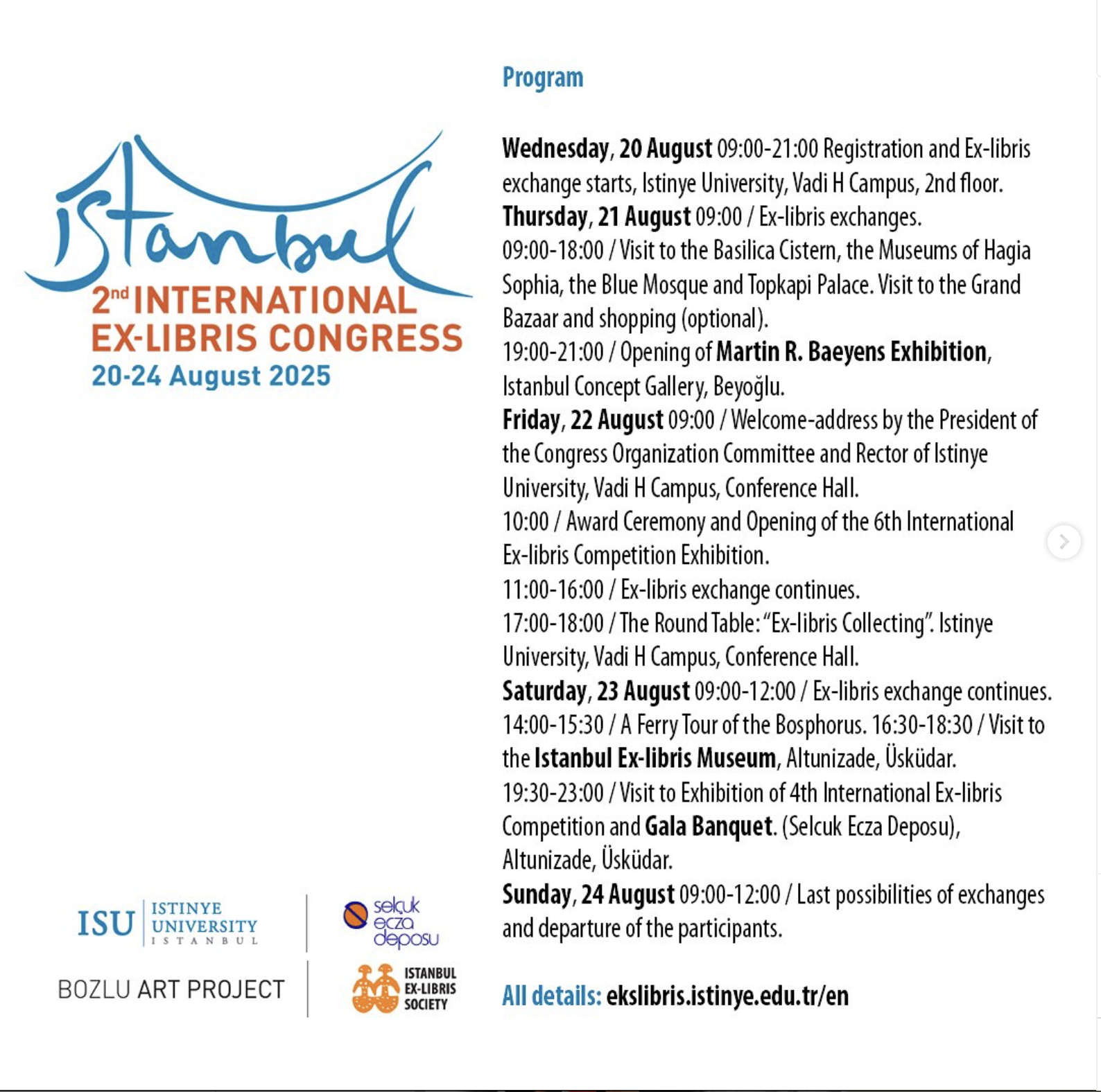İstinye Üniversitesi ev sahipliğinde, Bozlu Art Project, Selçuk Ecza Deposu ve İstanbul Ex-libris Derneği iş birliğiyle düzenlenen 2. Uluslararası Ex-libris Kongresi, 20–24 Ağustos 2025 tarihleri arasında İstanbul’da gerçekleşecek. Sanatın ve koleksiyonculuğun nadide alanlarından biri olan ex-libris kültürü, beş gün boyunca yerli ve yabancı sanatçıları, araştırmacıları ve koleksiyonerleri bir araya getirecek.