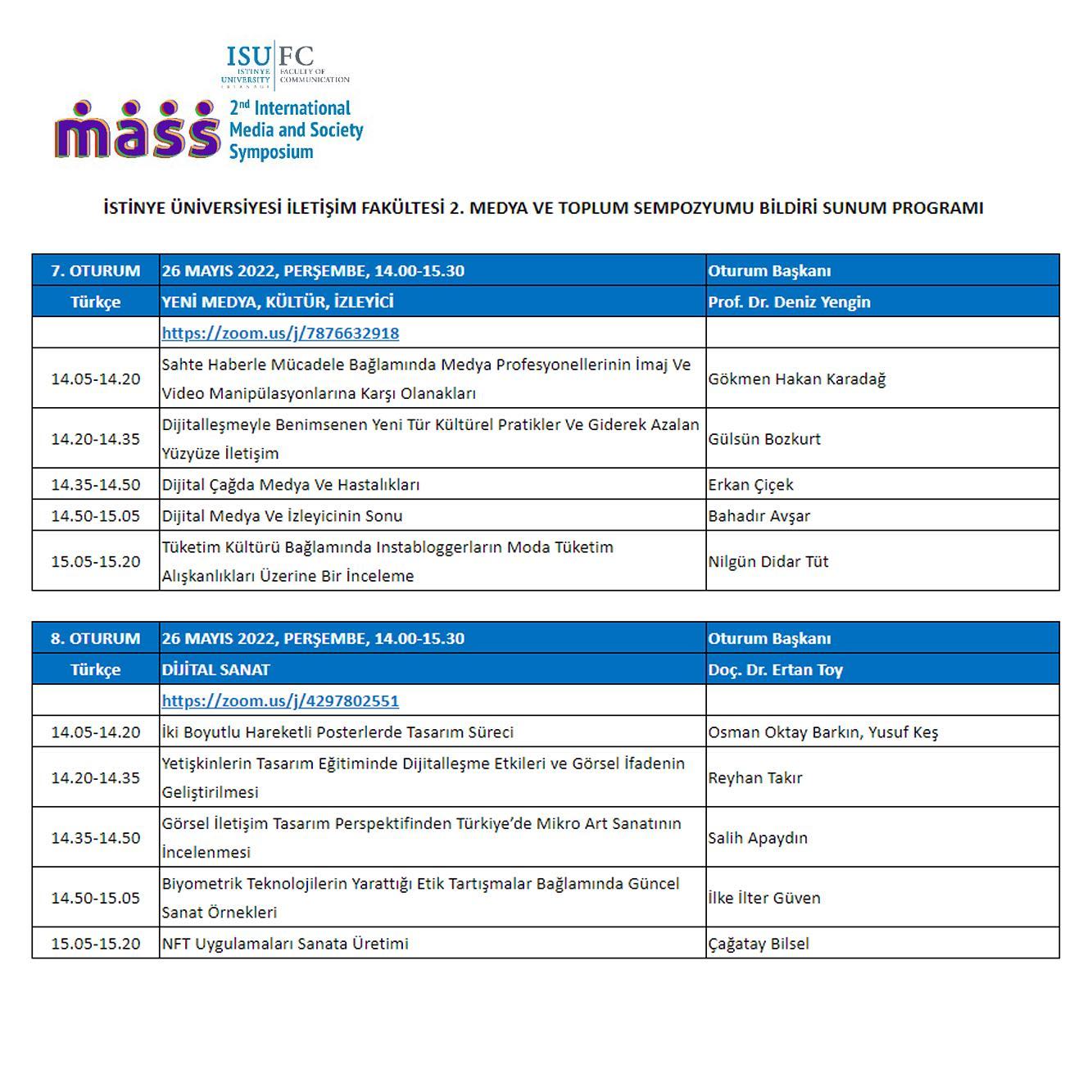 Bu kapsamda sempozyumun sekizinci oturumu DİJİTAL SANAT başlığıyla Doç. Dr. Ertan Toy'un oturum başkanlığında, 26 MAYIS 2022, PERŞEMBE, 14.00-15.30 tarihinde gerçekleştirildi. Program aşağıda sunulmaktadır: