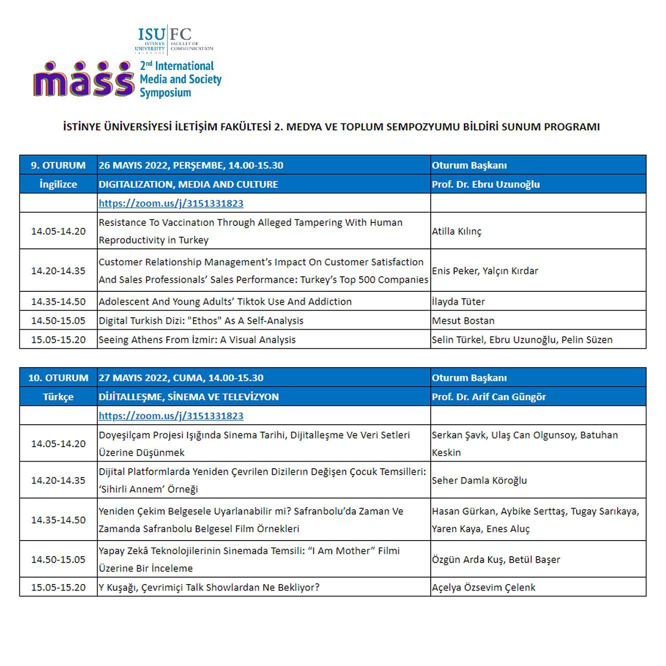 Bu kapsamda sempozyumun onuncu oturumu DİJİTALLEŞME, SİNEMA VE TELEVİZYON başlığıyla Prof. Dr. Arif Can Güngör'ün oturum başkanlığında, 27 MAYIS 2022, CUMA, 14.00-15.30 tarihinde gerçekleştirildi. Program aşağıda sunulmaktadır:
