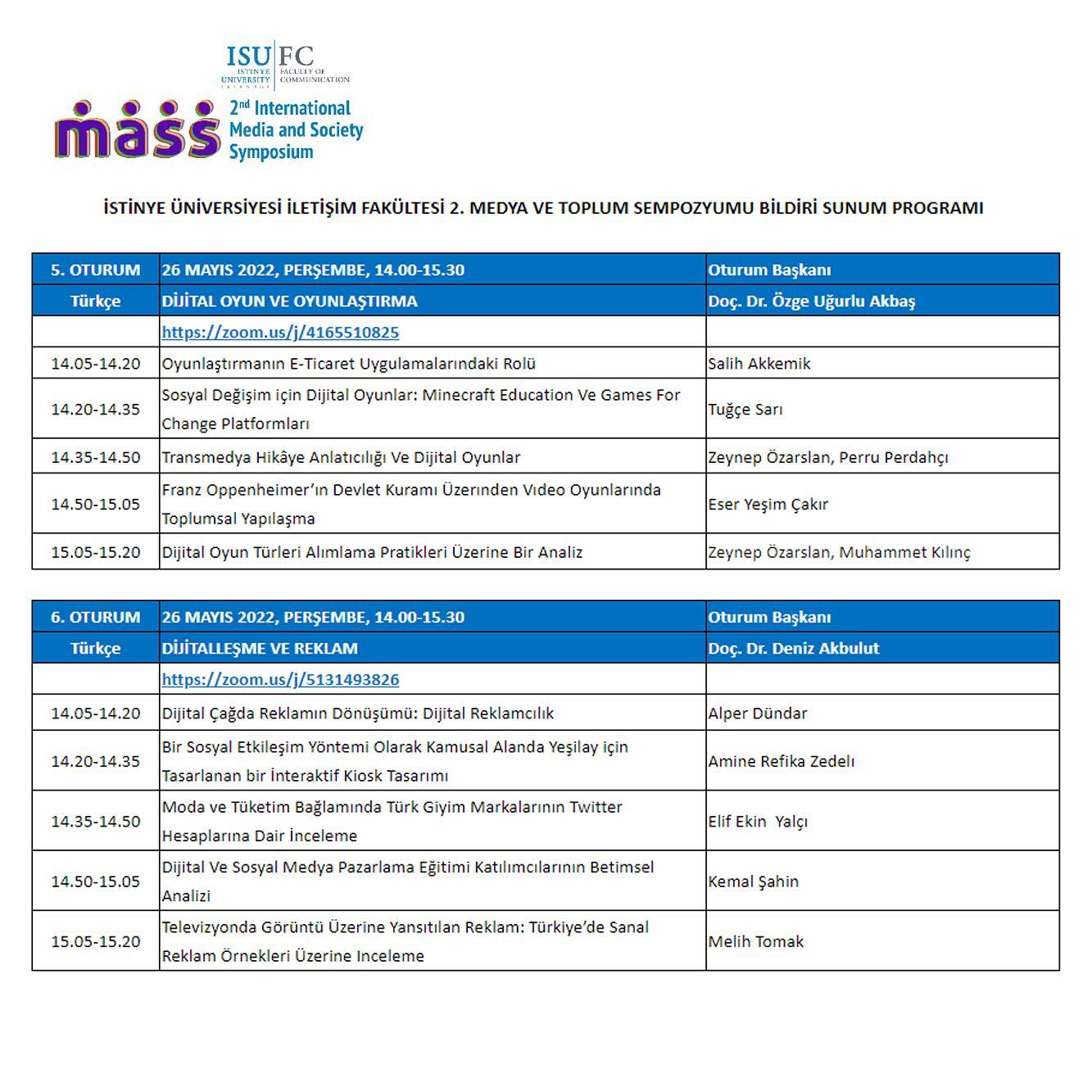 Bu kapsamda sempozyumun altıncı oturumu DİJİTALLEŞME VE REKLAM başlığıyla Doç. Dr. Deniz Akbulut'ın oturum başkanlığında, 26 MAYIS 2022, PERŞEMBE, 14.00-15.30 tarihinde gerçekleştirildi. Program aşağıda sunulmaktadır: