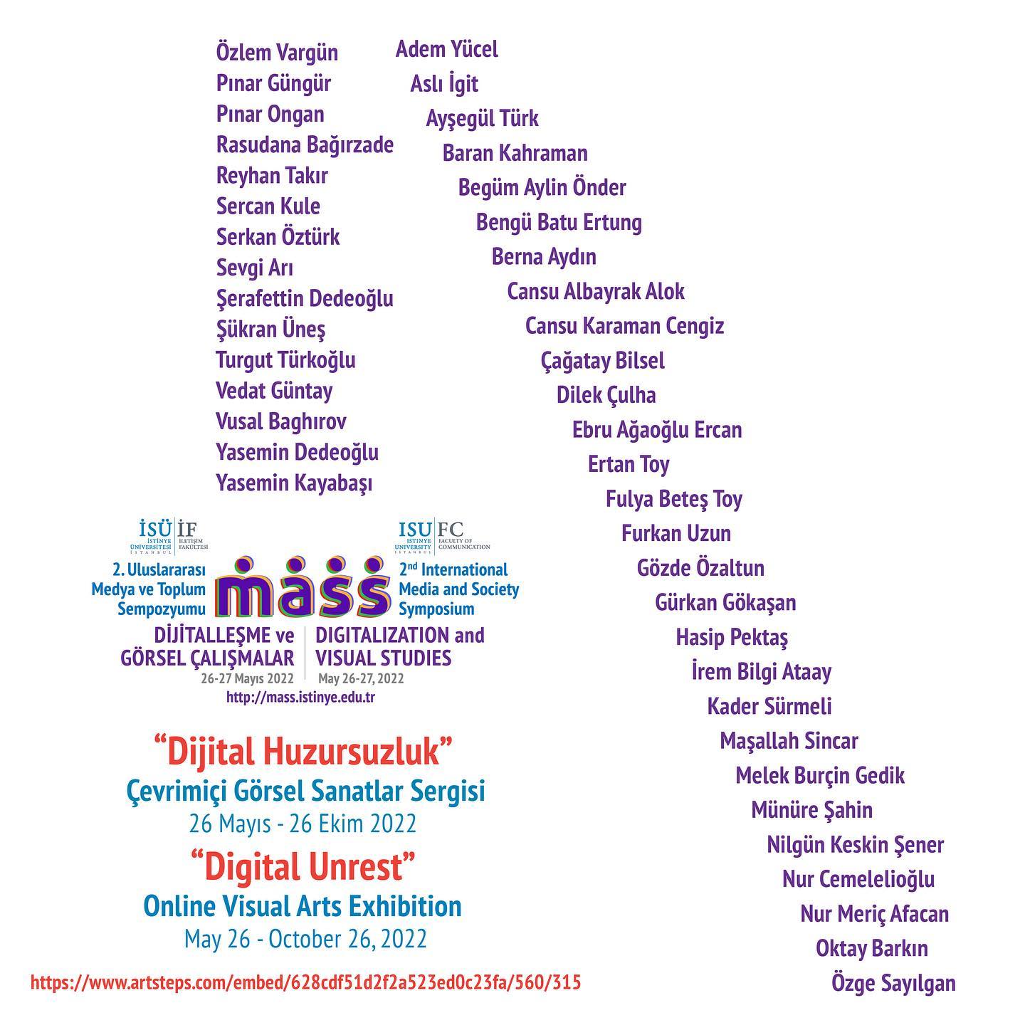İstinye Üniversitesi İletişim Fakültesi “Dijitalleşme ve Görsel Çalışmalar” başlıklı 2. Uluslararası Medya ve Toplum Sempozyumu’nda kuramsal çalışmalar yanında farklı disiplinlerde uygulama çalışmalarına ve çalıştaylara da yer verilmiştir. Sempozyum kapsamındaki 43 sanatçı ve tasarımcının “Dijital Huzursuzluk” konulu özgün çalışmaları, linkte [https://www.artsteps.com/embed/628cdf51d2f2a523ed0c23fa/560/315] görülebilir. Sergi, 26 Ekim 2022 tarihine kadar açıktır.