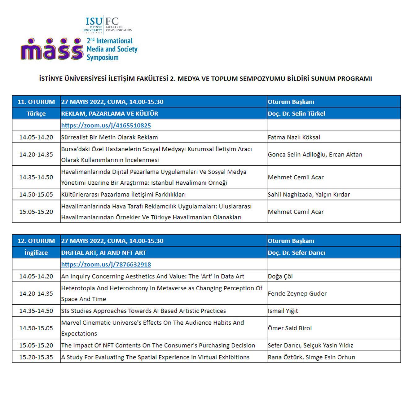 Bu kapsamda sempozyumun on birinci oturumu REKLAM, PAZARLAMA VE KÜLTÜR başlığıyla Doç. Dr. Selin Türkel'in oturum başkanlığında, 27 MAYIS 2022, CUMA, 14.00-15.30 tarihinde gerçekleştirildi. Program aşağıda sunulmaktadır: