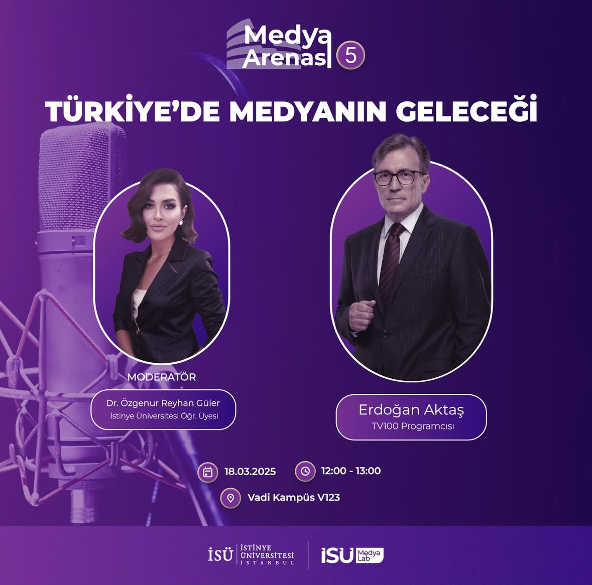 İstinye Üniversitesi İletişim Fakültesi Medya Merkezi tarafından düzenlenen Medya Arenası söyleşi serisinin beşinci etkinliği, Türk medya dünyasının deneyimli isimlerinden TV100 programcısı Erdoğan Aktaş’ı ağırladı. Etkinliğin moderatörlüğünü İletişim Fakültesi öğretim üyesi Dr. Özgenur Reyhan Güler üstlendi.