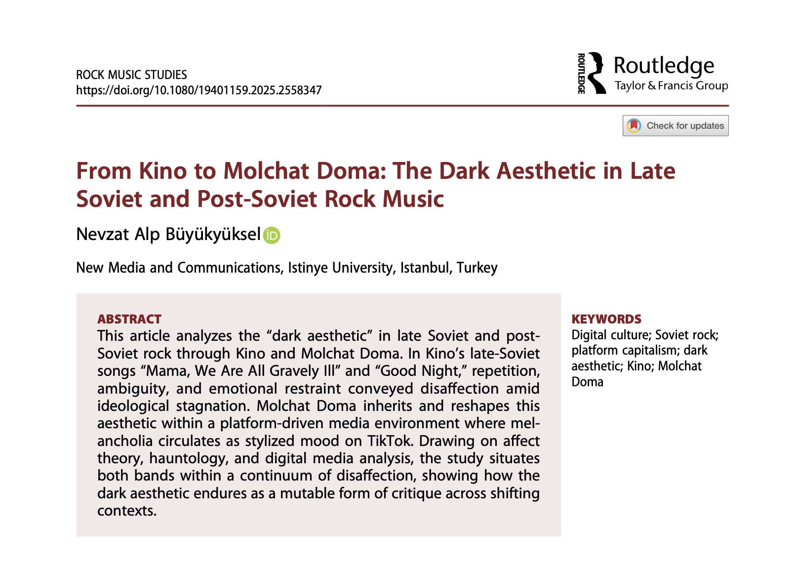 Fakültemiz Yeni Medya ve İletişim bölümü Araştırma Görevlisi Nevzat Alp Büyükyüksel’in kaleme aldığı “From Kino to Molchat Doma: The Dark Aesthetic in Late Soviet and Post-Soviet Rock Music” başlıklı makale, alanın saygın ve Scopus tarafından taranan dergilerinden Rock Music Studies (Taylor & Francis, Q2)’te yayımlanmıştır.