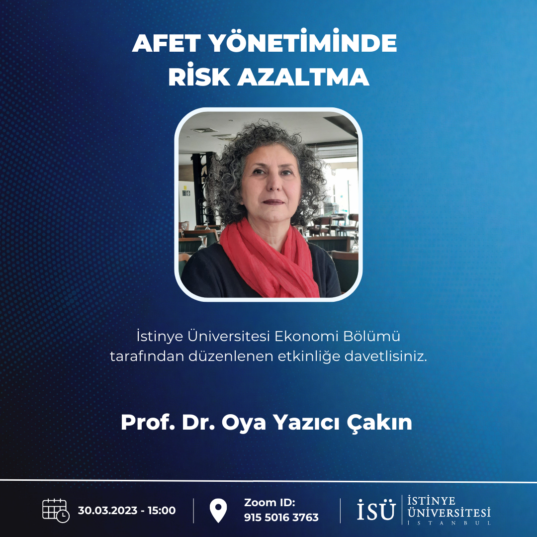 Prof. Dr. Oya Yazıcı ÇAKIN'ın anlatımıyla "Afet Yönetiminde Risk Azaltma" online konferansı 30 Mart 2023 tarihinde saat 15:00'te Zoom üzerinden gerçekleştirilmiştir.