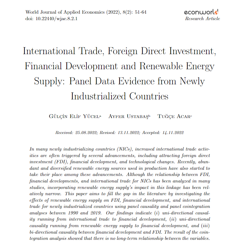 Bölüm Hocalarımızdan Doç. Dr. Ayfer Ustabaş’ ın Dr. Öğr. Üy. Gülçin Elif Yücel ve Tuğçe Acar ile ortak çalışmaları olan “International Trade, Foreign Direct Investment, Financial Development and Renewable Energy Supply: Panel Data Evidence from Newly Industrialized Countries” başlık makalesi World Journal of Applied Economics dergisinde yayımlandı. Makaleye ulaşmak için aşağıdaki bağlantıyı kullanabilirsiniz.