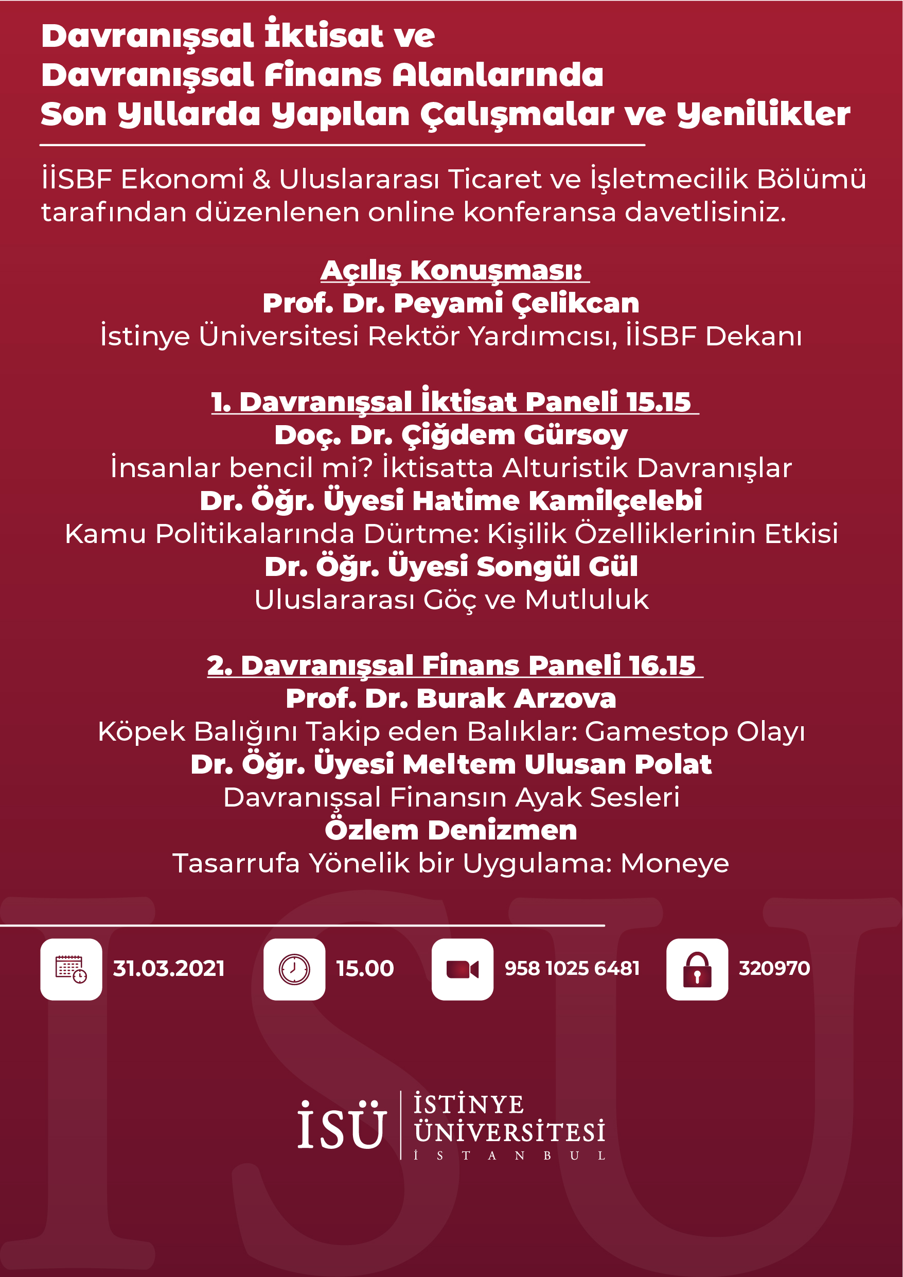 İktisadın farklı konularını tanıtmak amacıyla düzenlenen konferanslar serisinin ikincisinde davranışsal iktisada ek olarak davranışsal finans konuları da ele alındı. "Davranışsal İktisat ve Davranışsal Finans Alanlarında Son Yıllarda Yapılan Çalışmalar ve Yenilikler" başlığı altında iki oturum halinde düzenlenen konferansta İstinye Üniversitesi'nin yanı sıra Marmara Üniversitesi, Ağrı İbrahim Çeçen Üniversitesi ve Kırklareli Üniversitesi'nden katılımcılar da sunum yaptı.