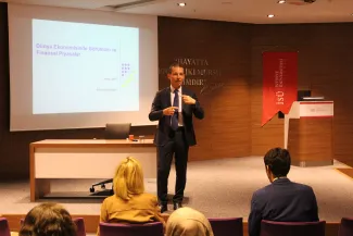 İstinye Üniversitesi İktisadi, İdari ve Sosyal Bilimler Fakültesi bünyesinde Ekonomi, İşletme ve Uluslararası Ticaret ve İşletmecilik Bölümleri tarafından düzenlenen ‘Dünya Ekonomisinde Görünüm ve Finansal Piyasalar’ konulu seminer ile İstinyeliler ile bir araya gelen Piri Reis Üniversitesi Rektör Yardımcısı Prof. Dr. Erhan Aslanoğlu, global ekonominin güncel görünümünü ve ticaret savaşlarını değerlendirdi.