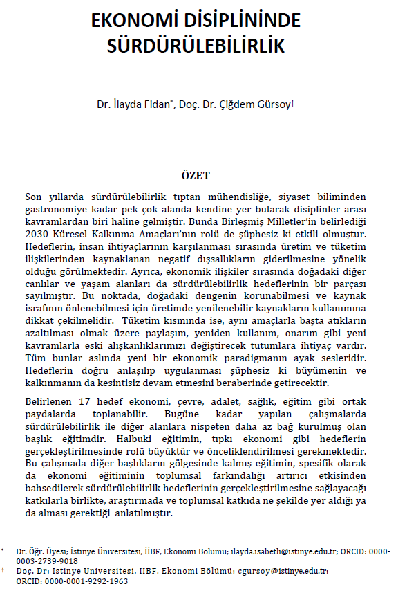 Ekonomi bölüm başkanımız Doç. Dr. Çiğdem Gürsoy ile bölüm Hocalarımızdan Dr. Öğr. Üy. İlayda İsabetli Fidan’ın “Akademik Disiplinlerde Sürdürülebilirlik” isimli kitapta yer alan “Ekonomi Disiplininde Sürdürülebilirlik” başlıklı bölümü 14.05.2023 tarihinde yayımlanmıştır