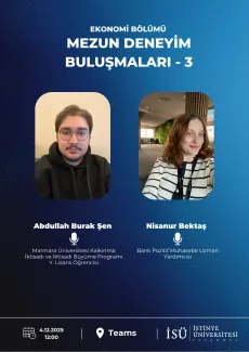 Ekonomi Bölümü Mezun Deneyimi Buluşmaları serisinin üçüncü etkinliği 2024-2025 mezunlarından Abdullah Burak Şen ve Nisanur Bektaş'ın konuşmalarıyla gerçekleştirilmiştir. Mezunlarımız İstinye sonrası eğitim ve iş tecrübelerini öğrencilerle paylaşmıştır. Öğrencilerimizin iş hayatından ve lisansüstü eğitimden ne bekleyebileceği, bu süreçte nelere ihtiyaç duyacakları ve hangi aşamada nelerle karşılaşabileceklerine dair bilgilendirici bu etkinlikte Ekonomi Bölümünden Bölüm Başkanı Doç. Dr. Çiğdem Gürsoy, Dr. Öğr. Üyesi İlayda İsabetli Fidan ve Arş. Gör. Talha Durmuş da hazır bulunmuştur.