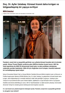 Ekonomi Bölümü öğretim üyesi ve EPAM Müdürü Doç. Dr. Ayfer Ustabaş, MarineDeal News’te yayımlanan röportajında pandemi, enerji krizi ve jeopolitik gerilimler son yıllarda küresel ticarette derin kırılmalara yol açtığından bahsetmiştir. Bu etkiler, ticareti daha kırılgan, bölgeler arası yakın tedarik bağlantılarının önem kazandığı ve stratejik sektörlere odaklanmanın öne çıktığı bir yapıya doğru evrilmesine sebep olduğuna değinmiştir.
