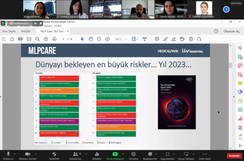 Söyleşinin ilk konuğu İstinye Üniversitesi öğretim üyesi Dr. Öğr. Üyesi Melek Yurdakul oldu. Dr. Yurdakul, sunumunda sürdürülebilirliği tüm boyutlarıyla kavramsal olarak tanımladı, bu konuda yapılan araştırmalardan örnekler verdi. Söyleşinin ikinci konuğu ise MLP Care Strateji ve Yatırımcı İlişkileri direktörü Dr. Deniz Can Yücel oldu. Dr. Yücel, sunumunda dünyamızı bekleyen en büyük riskleri açıkladıktan sonra sürdürülebilirliğin neden gerekli olduğunu ve MLP Care’in sürdürülebilirlik stratejilerini anlattı. Ayrıca, sürdürülebilirlik konusunda gündelik hayatımızda neler yapabileceğimizle ilgili tavsiyelerde bulundu. Son olarak sosyal girişimcilik kavramını açıkladı ve bu konuda örnekler vererek sunumunu tamamladı.