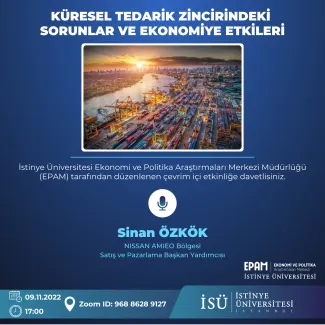 NISSAN AMIEO Bölgesi Satış ve Pazarlama Başkan Yardımcısı Sayın Sinan ÖZKÖK'ün konuşmacı olduğu Küresel Tedarik Zincirindeki Sorunlar ve Ekonomiye Etkileri isimli etkinlik 09.11.2022 Çarşamba günü Zoom üzerinden gerçekleştirildi.