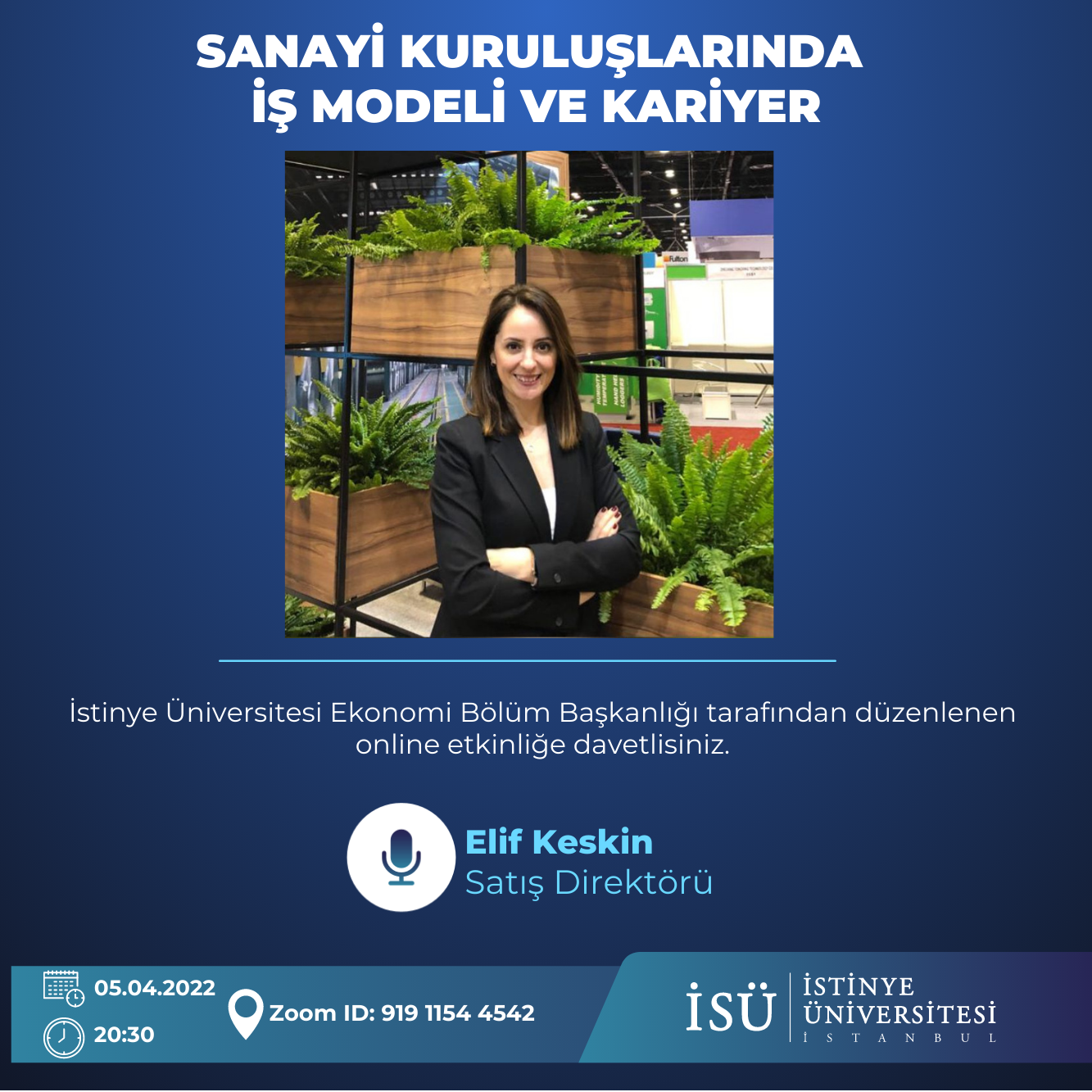 Ekonomi Bölümü olarak “Sanayi Kuruluşlarında İş Modeli ve Kariyer” başlığıyla düzenlediğimiz konferansta konuşmacı olarak Assan Alüminyum Endüstriyel Satış Direktörü Elif Keskin’i ağırladık.