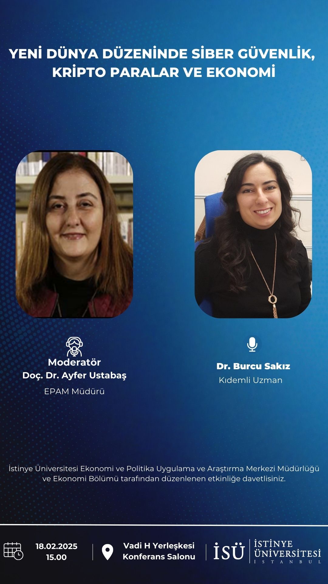 EPAM ve Ekonomi Bölümünün birlikte düzenlediği ve EPAM Müdürü Doç. Dr. Ayfer Ustabaş Hocamızın moderatör olduğu etkinlikte Dr. Burcu Sakız ekonominin hızlı değişen gündemi içerisinde siber güvenlik ve kripto paraların yeri ve güvenliği konularında bilgi aktarımında bulundu.
