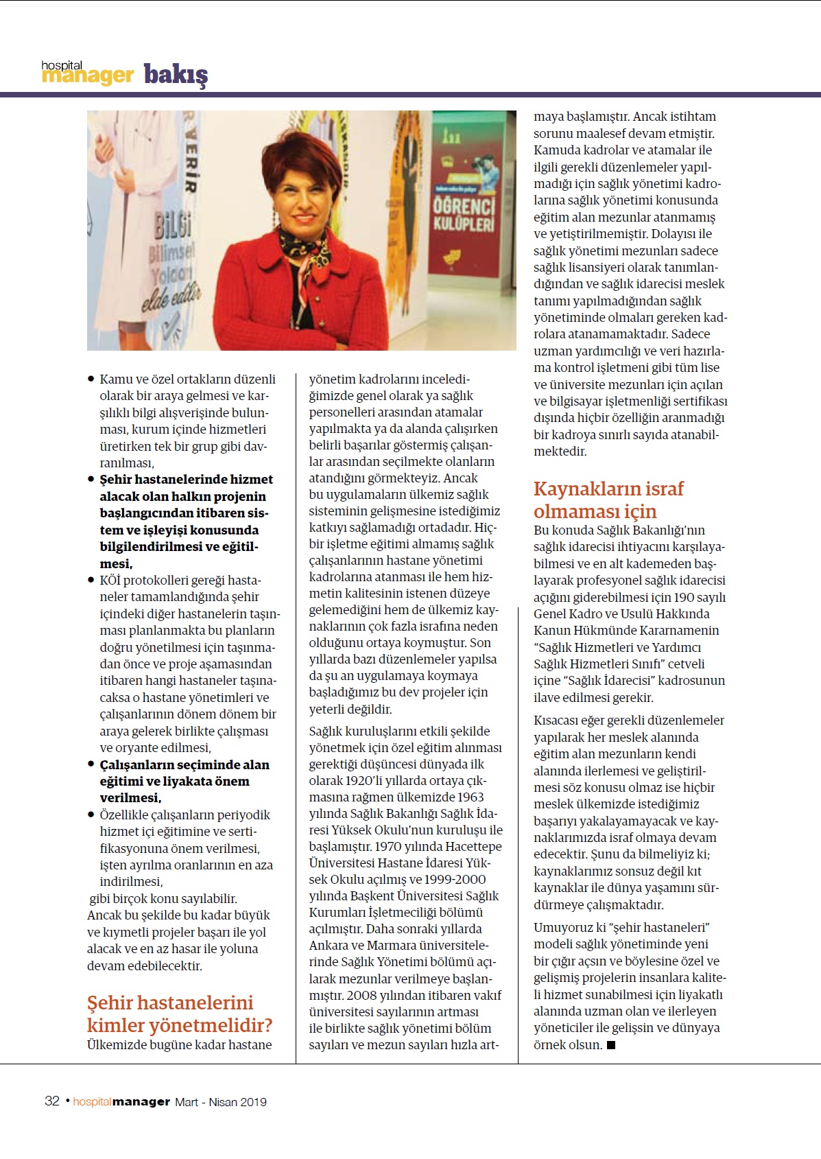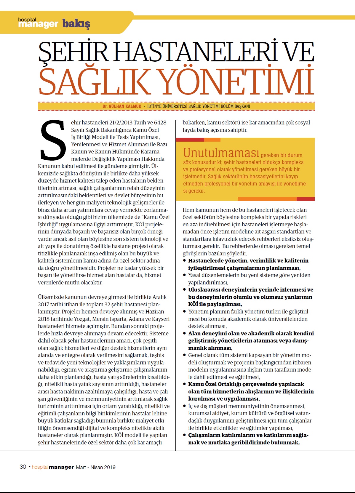 “Tüm Yönleriyle Şehir Hastaneleri” başlıklı dosya konusunun işlendiği, Mart-Nisan 2019 sayısında yer alan makalesinde Dr. Öğr. Üyesi Gülhan Kalmuk şehir hastanelerinin yönetimine dair tavsiyelerde bulundu. Şehir hastanelerinin, sağlık sektörünün hassasiyetlerini kaybetmeden profesyonel bir yönetim anlayışı ile yönetilmesi gerektiğinin altını çizen Kalmuk, hastanelerin işletmeye başlamadan önce asgari standartları ve standartlara kılavuzluk edecek rehberleri eksiksiz oluşturması gerektiğini belirtti. Sağlık yönetimi mezunlarının şehir hastanelerinde yönetici pozisyonlarında görev almasının önemine vurgu yaptı.
