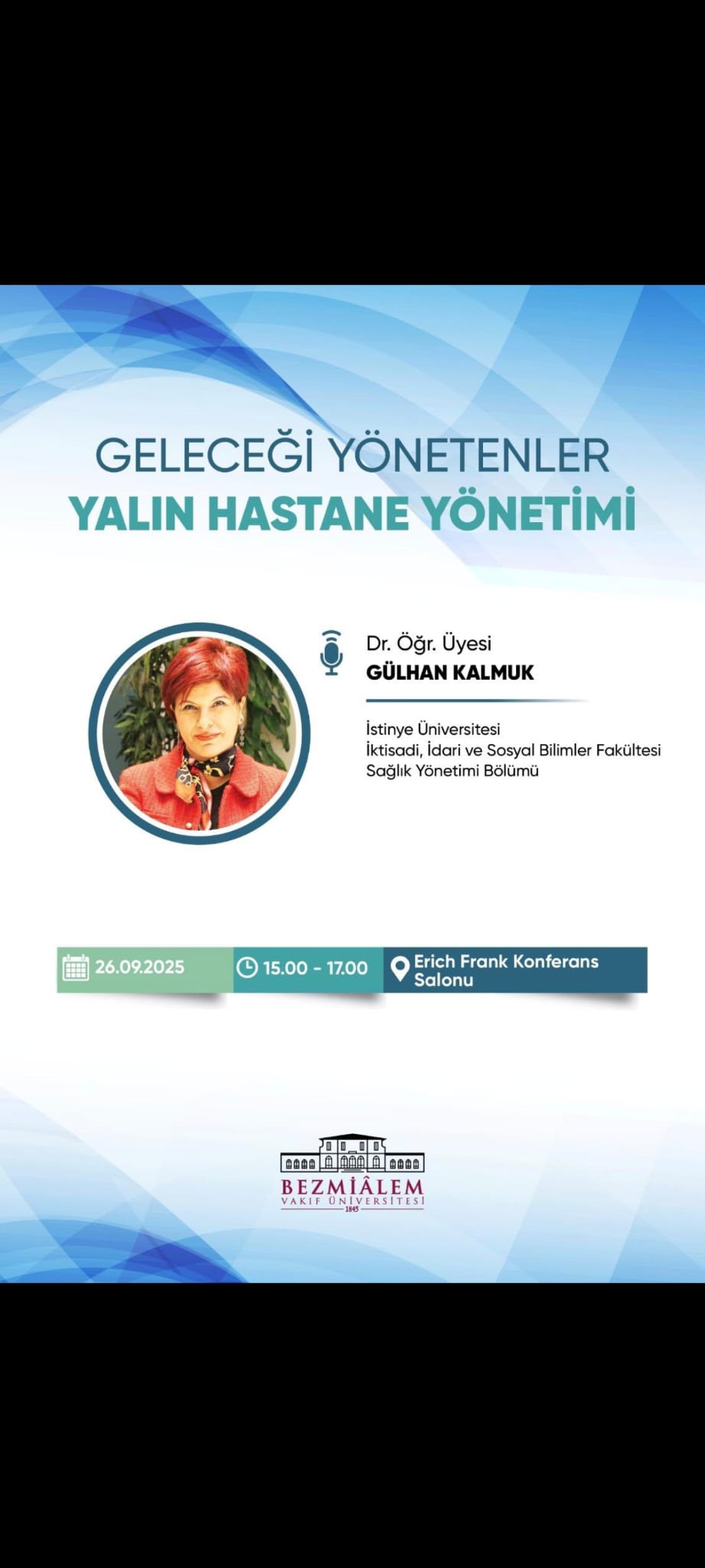 İstinye Üniversitesi İktisadi, İdari ve Sosyal Bilimler Fakültesi Sağlık Yönetimi Bölümü öğretim üyesi Dr. Öğr. Üyesi Gülhan Kalmuk, 26 Eylül 2025 tarihinde Bezmialem Vakıf Üniversitesi Erich Frank Konferans Salonu’nda “Geleceği Yönetenler: Yalın Hastane Yönetimi” başlıklı kapsamlı bir eğitim verdi. Sağlık yöneticileri, akademisyenler ve hastane çalışanlarının yoğun ilgi gösterdiği program, sağlık hizmetlerinde verimliliği artırmaya yönelik güncel yaklaşımları sahaya taşıması bakımından büyük önem taşıdı.