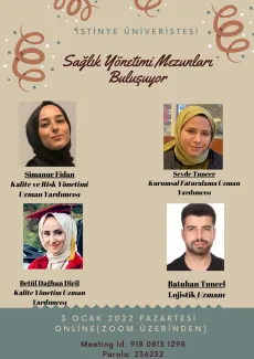İstinye Üniversitesi Sağlık Yönetimi bölümü olarak mezunlarımız ile bir araya gelme geleneği yolunda ilk adımı atmış bulunuyoruz. Mezun öğrencilerimizden sağlık yönetimi bölümünün artı ve eksilerini, onlara neler kattığını, iş hayatındaki beklenti ve kariyer hedeflerini dinledik. Ayrıca sağlık yönetimi bölümünde okuyan arkadaşlarına da neler yapmaları gerektiği konusunda birbirinden faydalı tavsiyelerde bulundular. Karşılıklı iletişim ve etkileşimin oldukça yüksek olduğu verimli bir etkinlik oldu. Bizlerin davetini kırmayarak etkinliğe katılım sağlayan Kalite Yönetimi Uzman Yardımcısı Betül Dağhan Diril'e, Kalite ve Risk Yönetimi Uzman Yardımcısı Simanur Fidan'a, Kurumsal Faturalama Uzman Yardımcısı Zeynep Sevde Tuncer'e ve Liojistik Uzmanı Batuhan Tuncel'e çok teşekkür ederiz.