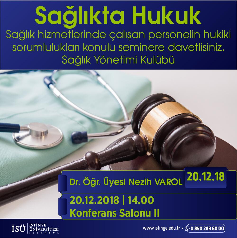 Sağlık Yönetimi Kulubü “Sağlıkta Hukuk, sağlık hizmetlerinde çalışan personelin hukuki sorumlulukları” konulu semineri, 20 Aralık tarihinde Konferans Salonu 2’de gerçekleştirdi. Üniversitemiz öğretim üyesi ve Medical Park Hastaneler Grubu Hukuk Danışmanı Dr. Öğretim Üyesi Nezih Varol’un konuşmacı olduğu seminer, sağlık yönetimi ve tıbbi dökümantasyon ve sekreterlik bölümü öğrencilerinin katılımıyla gerçekleşti.