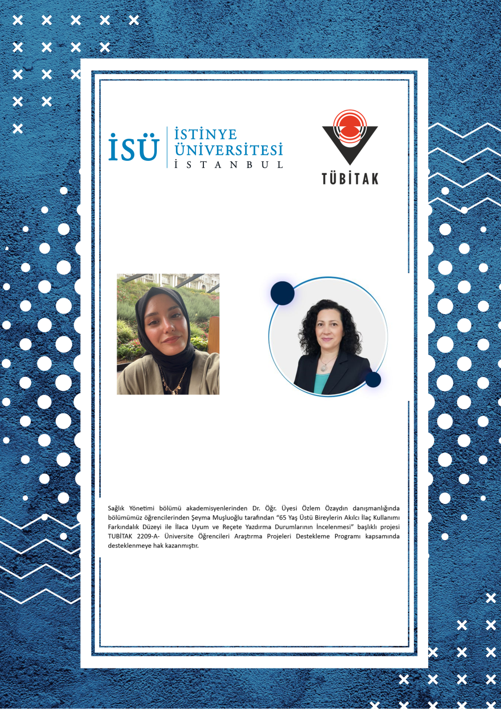 Sağlık Yönetimi bölümü akademisyenlerinden Dr. Öğr. Üye. Özlem ÖZAYDIN danışmanlığında bölümümüz öğrencilerinden Proje yürütücüsü Şeyma Muşluoğlu ve Adem Turna tarafından “65 Yaş Üstü Bireylerin Akılcı İlaç Kullanımı Farkındalık Düzeyi ile İlaca Uyum ve Reçete Yazdırma Durumlarının İncelenmesi” başlıklı projesi TUBİTAK 2209-A- Üniversite Öğrencileri Araştırma Projeleri Destekleme Programı kapsamında desteklenmeye hak kazanmıştır.