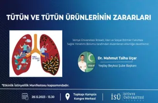 Sağlık Yönetimi Bölümü akademisyenlerimizden Dr. Öğr. Üyesi Özlem Özaydın tarafından TÜBİTAK-Sosyal ve Beşeri Bilimlerde Yenilikçi Çözümler Araştırma Destek Programı kapsamında yürütülen "Üniversite Öğrencilerinde Sigara Farkındalığını Arttırma ve Davranış Değişikliği Oluşturma Müdahaleleri: Tütünsüz Fakülte Projesi" doğrultusunda Yeşilay Beykoz Şube Başkanı Dr. Mahmut Talha Uçar' ın katılımı ile "Tütün ve tütün ürünlerinin zararları" temalı İstenyelilik Manifestosu kapsamında etkinlik düzenlenmiştir.