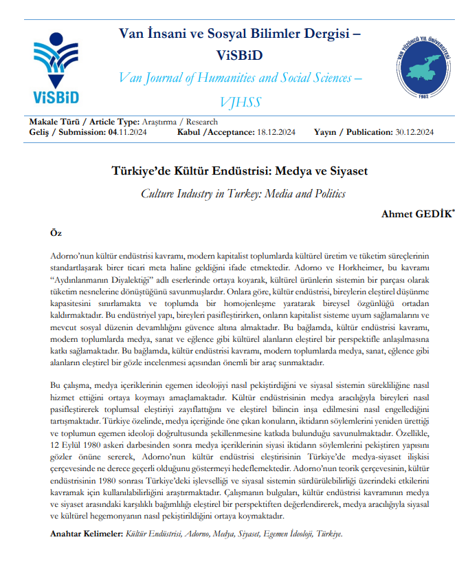 Van İnsani ve Sosyal Bilimler Dergisi'nin 2024 Aralık ayındaki sayısında Arş. Gör. Dr. Ahmet Gedik'in "Türkiye’de Kültür Endüstrisi: Medya ve Siyaset" isimli makalesi yayımlanmıştır. Hocamızı tebrik eder, başarılar dileriz.