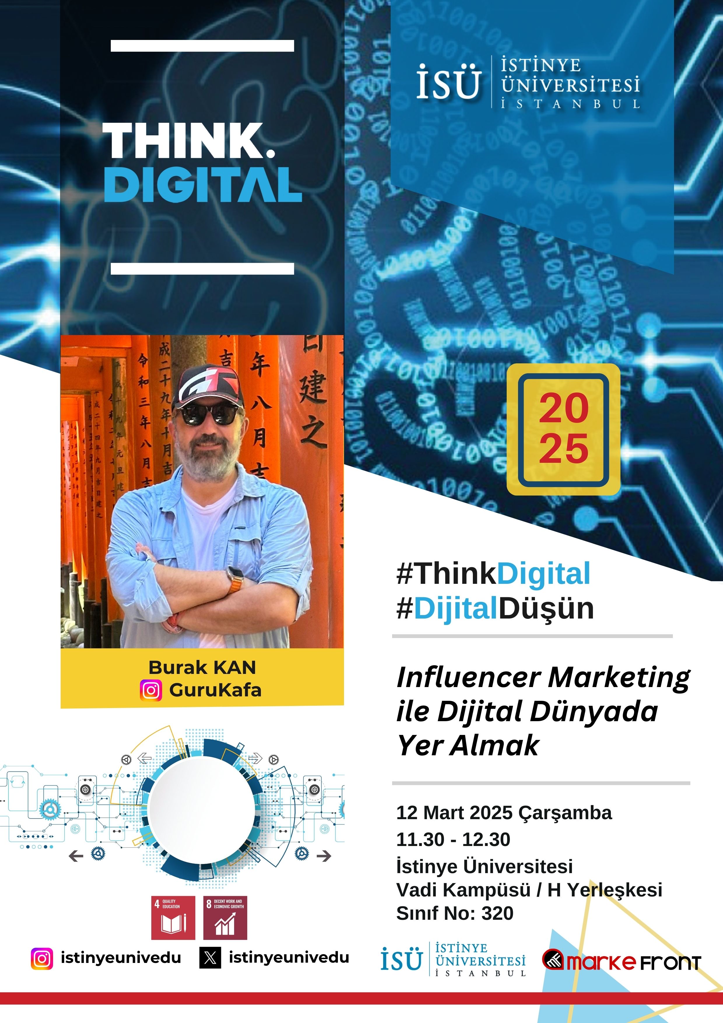 Dersin ikinci ayağında, 12 Mart 2025 tarihinde influencer pazarlaması alanında deneyimli isimlerden Burak Kan (GuruKafa) konuk edilmiştir. “Influencer Marketing ile Dijital Dünyada Yer Almak” başlıklı etkinlikte, sosyal medya üzerinden kitleye ulaşma yöntemleri, güven ve itibar inşası, içerik stratejileri ve dijital ekonomide görünür olmanın yolları katılımcılarla paylaşılmıştır. Burak Kan, sosyal medya kullanıcılarının yalnızca takipçi değil, aynı zamanda etkileşim odaklı topluluklar oluşturabileceğine vurgu yapmıştır.