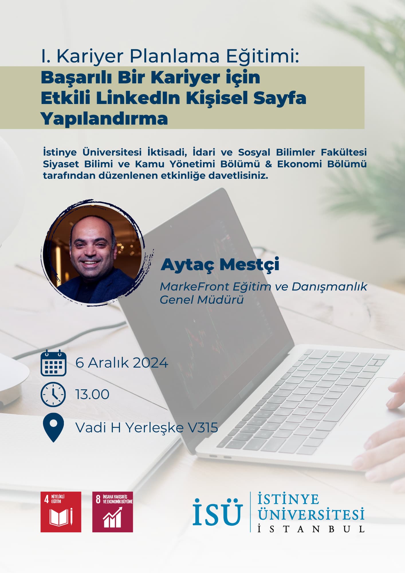 2025 Bahar döneminde İstinye Üniversitesi İktisadi, İdari ve Sosyal Bilimler Fakültesi Siyaset Bilimi ve Kamu Yönetimi Bölümü öncülüğünde açılan “Sosyal Ağlarda Kariyer Yönetimi” dersi, dijitalleşen iş dünyasında bireysel farkındalığı yüksek, stratejik düşünebilen ve görünürlüğünü bilinçli şekilde yöneten mezunlar yetiştirme hedefiyle tasarlanmıştır. Dersin yürütücülüğünü, dijital kariyer planlaması ve kişisel markalaşma konularında uzmanlaşmış bir isim olan Aytaç Mestçi üstlenmiştir.