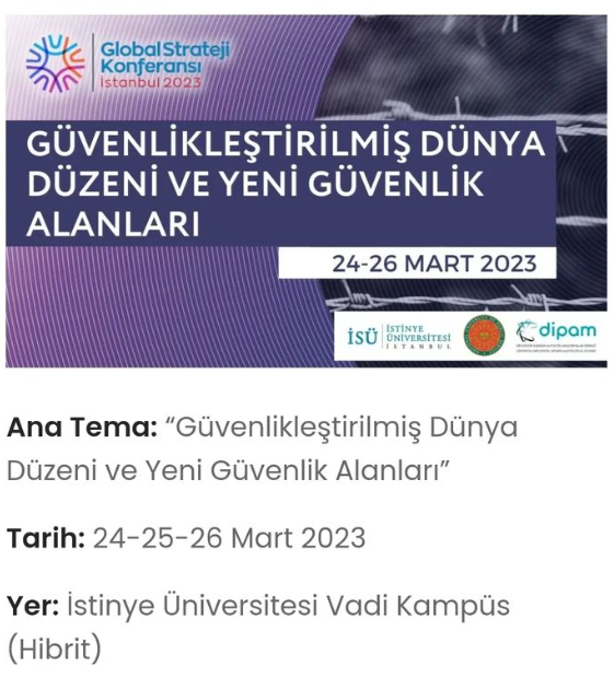 Her yıl önemli gündemlerin akademik bir vizyonla değerlendireceği Global Strateji Konferansı’nın ilki, 24-26 Mart 2023 tarihlerinde İstinye Üniversitesi ev sahipliğinde Diplomatik İlişkiler ve Politik Araştırmalar Merkezi (DİPAM) ve Macaristan National University of Public Service iş birliği gerçekleşti. Bu yıl ana teması “Güvenlikleştirilmiş Dünya Düzeni ve Yeni Güvenlik Alanları” olarak belirlenen konferansta, farklı alanlardan uzmanların katılımı ile güvenlik fenomeninin birçok faktörünün dönüşen şekil ve şartları ile küresel etkileri zengin bakış açısı derin bir analiz ortamında tartışıldı.