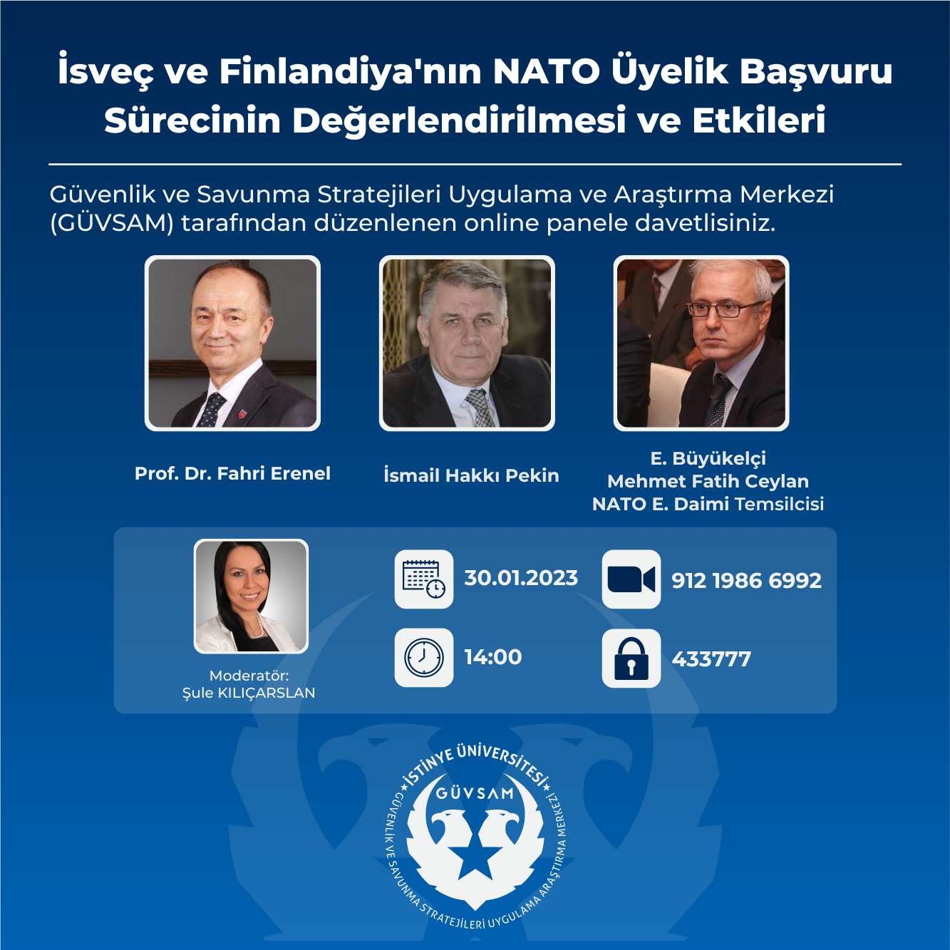 Güvenlik ve Savunma Stratejileri Uygulama ve Araştırma Merkezi (GÜVSAM)'nin düzenlediği "İsveç ve Finlandiya'nın NATO Üyelik Başvuru Sürecinin Değerlendirilmesi ve Etkileri Paneli" 30.01.2023 tarihinde gerçekleştirildi.