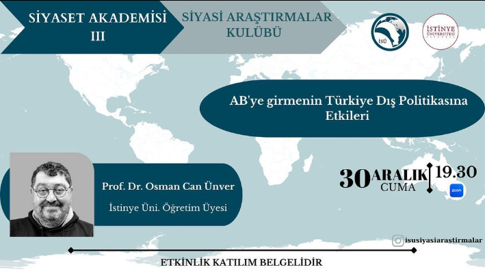 Siyasi Araştırmalar Kulübü'nün her yıl düzenlediği Siyaset Akademisi'nin üçüncüsünde Uluslararası İlişkiler Bölümü Prof. Dr. Osman Can ÜNVER, "AB'ye Girmenin Türk Dış Politikasına Etkileri" başlıklı semineriyle yer aldı.