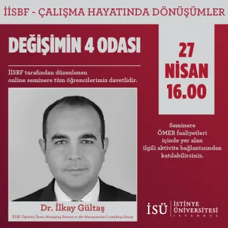 Fakültemiz Öğretim Üyesi Dr. İlkay Gültaş örgütler ve bireyler bazında oldukça dikkat çekici olan "değişim konusu" hakkında bir webinar düzenlemiştir. Gültaş değişimin 4 odasını; memnuniyet/tatmin, ilham/yenilenme, oto sansür/reddetme ve karmaşa/kaos olarak açıklamış ve katılımcılar beraber interaktif bir şekilde uygulanmaya çalışılmıştır.