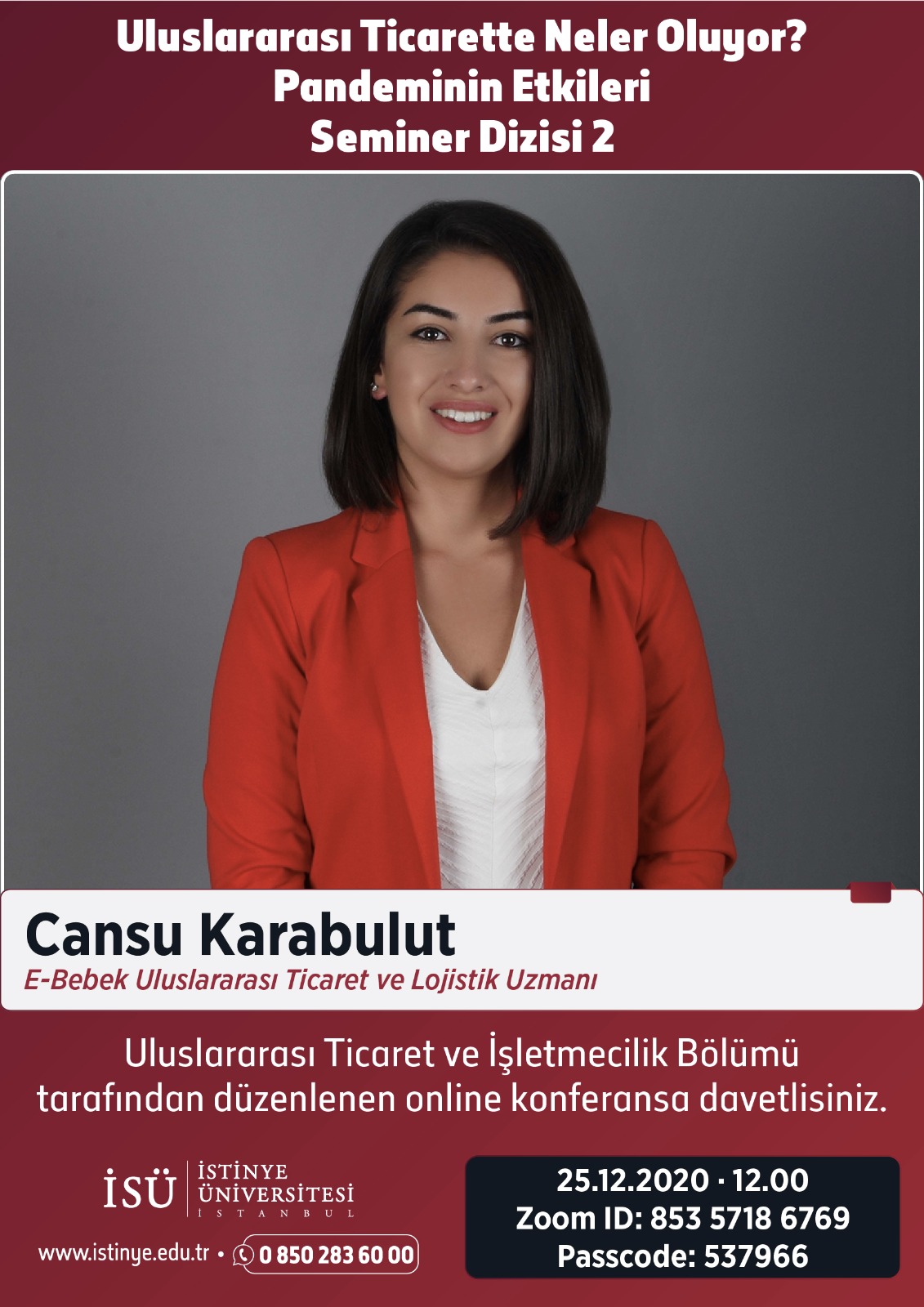 Uluslararası Ticaret ve İşletmecilik bölümünün davetlisi olarak E-Bebek Uluslararası Ticaret ve Lojistik Uzmanı Cansu Karabulut, "Uluslararası Ticarette Neler Oluyor" ve Pandeminin Etkileri temalı iki bölümden oluşan bir seminer serisi gerçekleştirilmiştir.