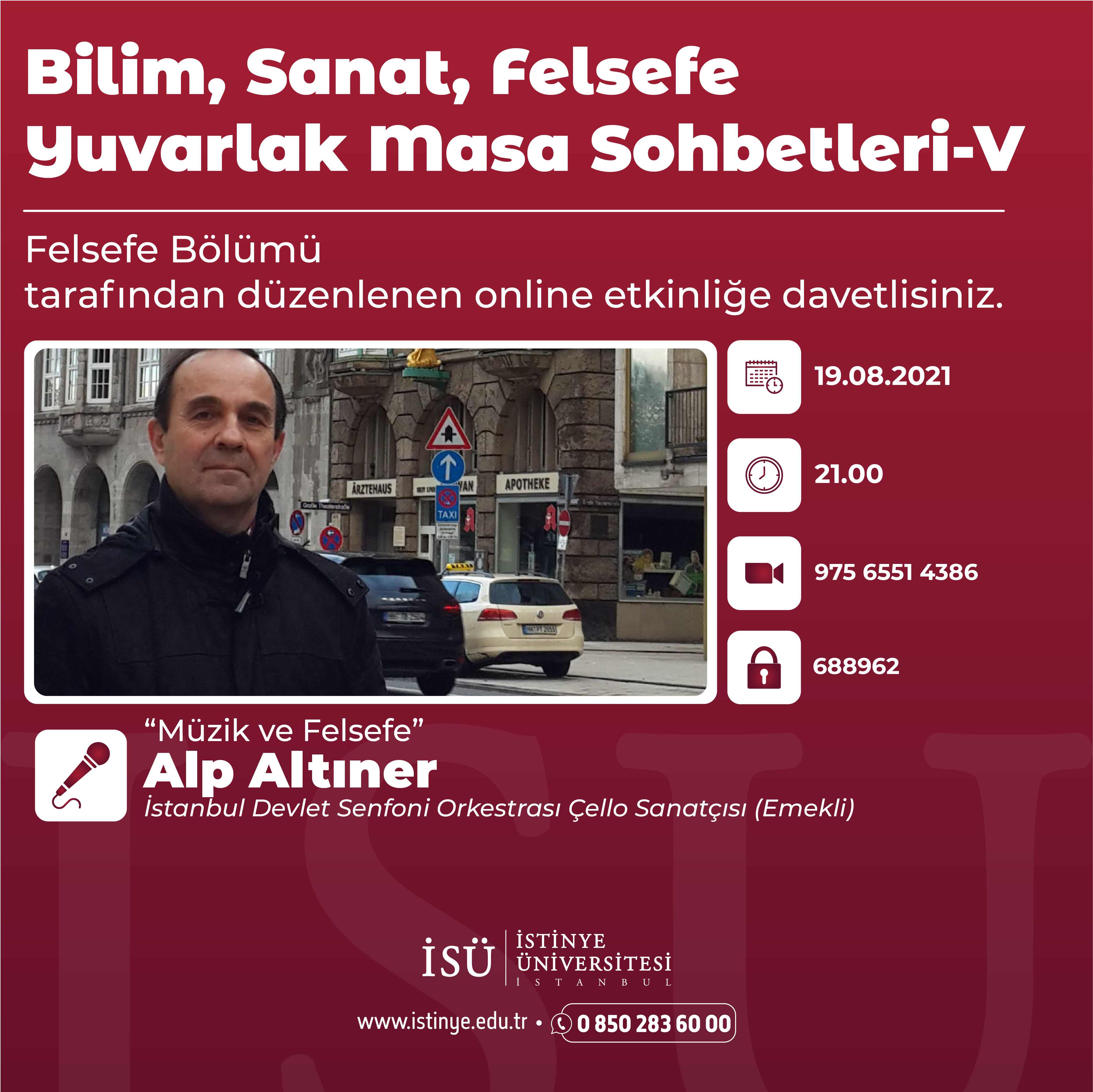 Bilim, sanat ve felsefe temalı Yuvarlak Masa Sohbetleri'nin beşinci konuğu, İstanbul Devlet Senfoni Orkestrası Çello Sanatçısı (emekli) Alp Altıner oldu. Müzik ve felsefe arasındaki ilişki, bu ilişkideki kurucu kavramlar, duygular ve duyguların müzik aracılığıyla nesnelleştirilmesi yeniden sorgulandı.