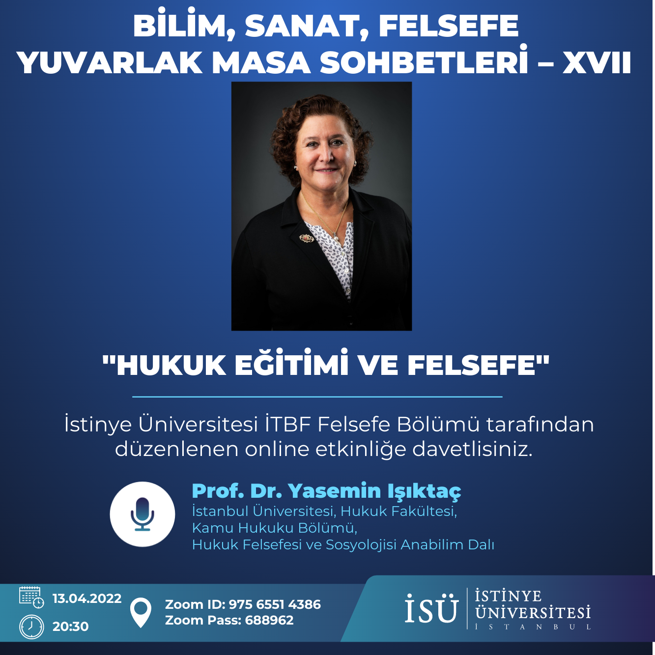 Bilim, sanat ve felsefe temalı Yuvarlak Masa Sohbetleri'nin on sekizinci konuğu, İstanbul Üniversitesi, Hukuk Fakültesi, Kamu Hukuku Bölümü, Hukuk Felsefesi ve Sosyolojisi Ana Bilim Dalı Öğretim Üyesi, Prof. Dr. Yasemin Işıktaç oldu.