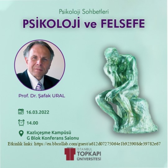 Felsefe Bölüm Başkanı Prof. Dr. Hayri Şafak Ural, 16.03.2022 tarihinde, İstanbul Topkapı Üniversitesi tarafından düzenlenen Psikoloji Sohbetleri adlı toplantıda, davetli katılımcı olarak "Psikoloji ve Felsefe" başlıklı bir konuşma yaptı.