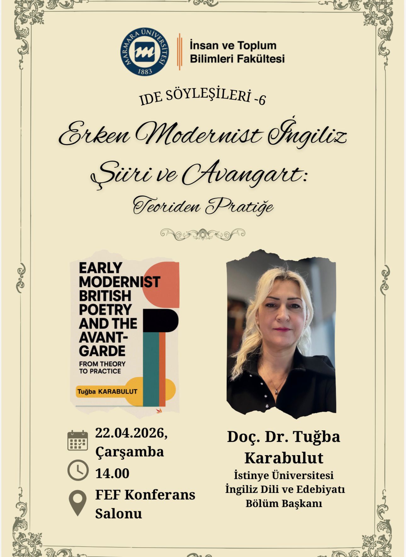 İngiliz Dili ve Edebiyatı Bölüm Başkanı Doç. Dr. Tuğba Karabulut, 22 Nisan 2026 tarihinde Marmara Üniversitesi İngiliz Dili ve Edebiyatı Bölümü tarafından düzenlenen İDE Söyleşileri kapsamında “Erken Modernist İngiliz Şiiri ve Avangart: Teoriden Pratiğe” başlıklı bir konuşma gerçekleştirecektir.