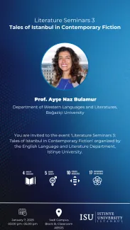 İngiliz Dili ve Edebiyatı Bölümünün düzenlediği "Edebiyat Seminerleri" kapsamında 7 Ocak 2025 tarihinde AB Blok Vadi Kampüste gerçekleştirilen etkinlikte Boğaziçi Üniversitesi Batı Dilleri ve Edebiyatları Bölümünden Prof. Dr. Ayşe Naz Bulamur "Tales of Istanbul in Contemporary Fiction" isimli konuşmasını gerçekleştirdi. Konuşma sonrası öğrencilerin soruları cevaplandı. Etkinliğe öğrenciler yoğun ilgi gösterdiler.