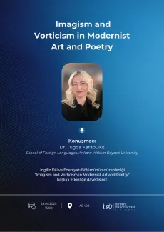 İngiliz Dili ve Edebiyatı Bölümünün 29 Mayıs 2025 tarihinde düzenlediği etkinlikte Ankara Yıldırım Beyazıt Üniversitesi Yabancı Diller Yüksekokulundan Dr. Tuğba Karabulut "Imagism and Vorticism in Modernist Art and Poetry" isimli konuşmasını gerçekleştirmiştir. Kendisine değerli katkılarından dolayı teşekkürlerimizi sunarız.