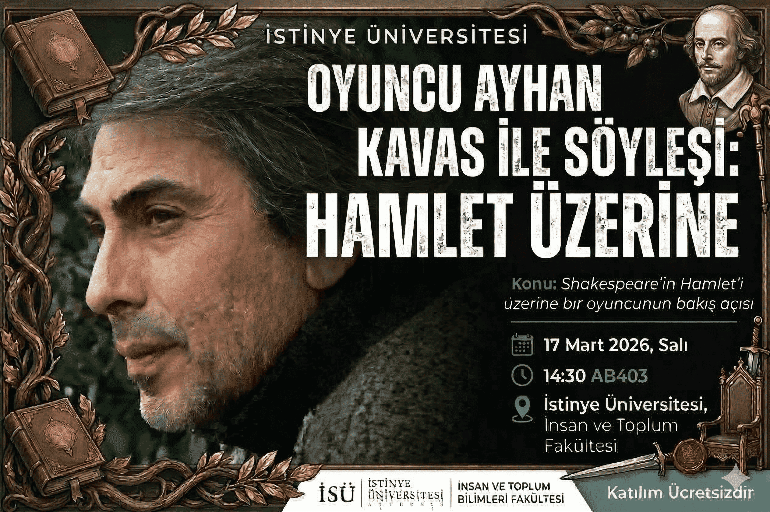 William Shakespeare’in dünya edebiyat tarihindeki en önemli yapıtlarından biri olan Hamlet, bu söyleşide bir oyuncunun bakış açısı ile ele alınacaktır. Derinlikli bir sohbetin gerçekleştirileceği bu etkinliğe tüm akademik kadromuz ve öğrencilerimiz davetlidir.