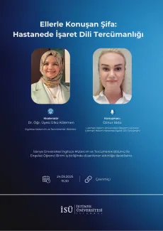 İstinye Üniversitesi İngilizce Mütercim ve Tercümanlık Bölümü ile Engelsiz Öğrenci Birimi iş birliğinde 24 Mayıs 2025 Cumartesi günü, saat 15.30'da çevrimiçi gerçekleştirilecek olan "Ellerle Konuşan Şifa: Hastanede İşaret Dili Tercümanlığı" konulu etkinliğe davetlisiniz.