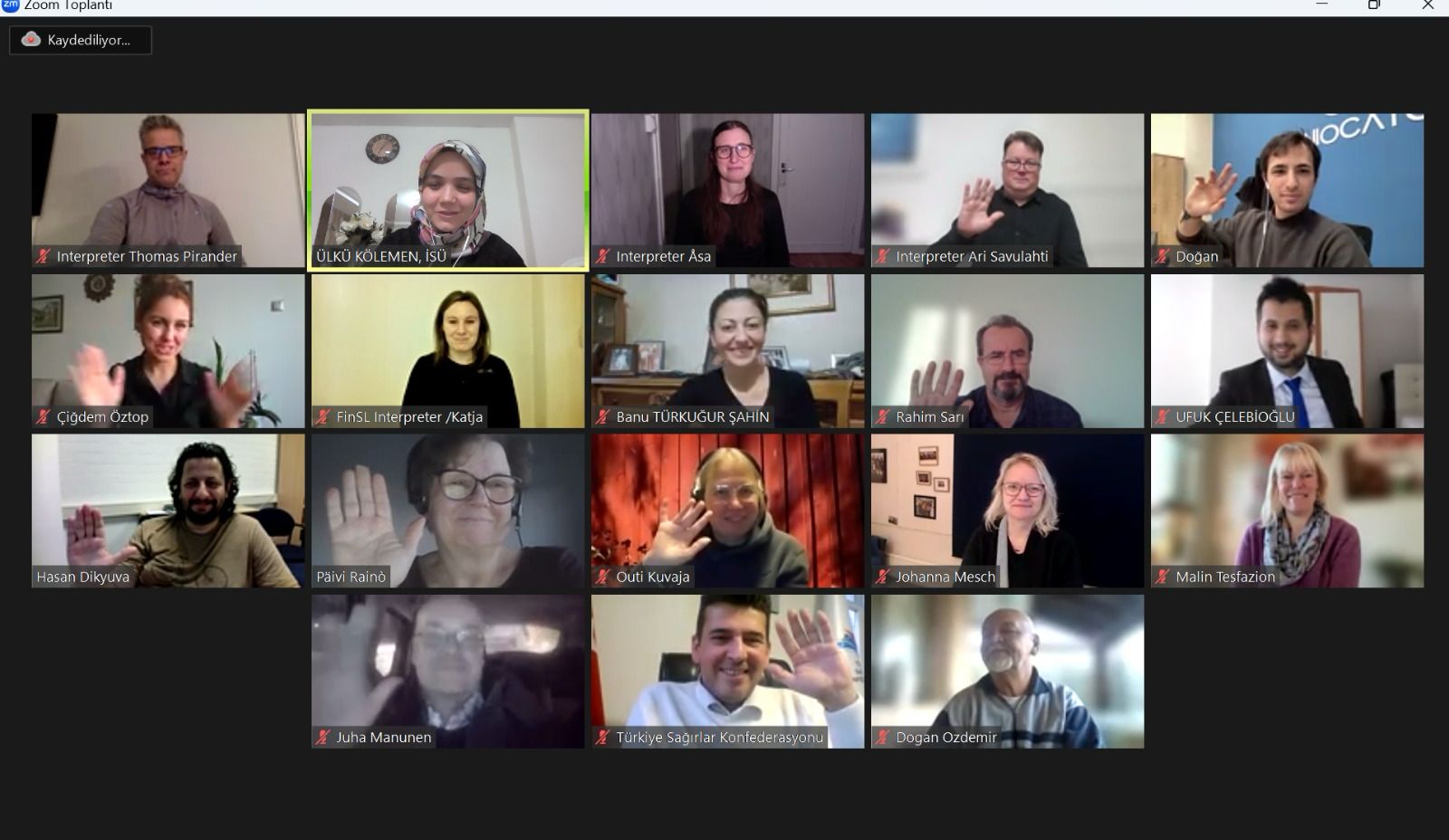 Erasmus KA2 "EDUSIGN & SIGNEDU: İşaret Dili Tercümanlığı Müfredat Hazırlığı & İşaret Dilinde Yapay Zekâ Ortak Girişimi" projesi kapsamında, 19 Aralık 2023 tarihinde Finlandiya’dan HUMAK Uygulamalı Bilimler Üniversitesi; İsveç’ten Stockholm Üniversitesi ve Türkiye’den İstinye Üniversitesi, Türkiye Sağırlar Konfederasyonu ve İşaret Dili Tercümanları Derneği’nden araştırmacılar, çevrimiçi olarak gerçekleşen uluslararası toplantıda bir araya geldi.