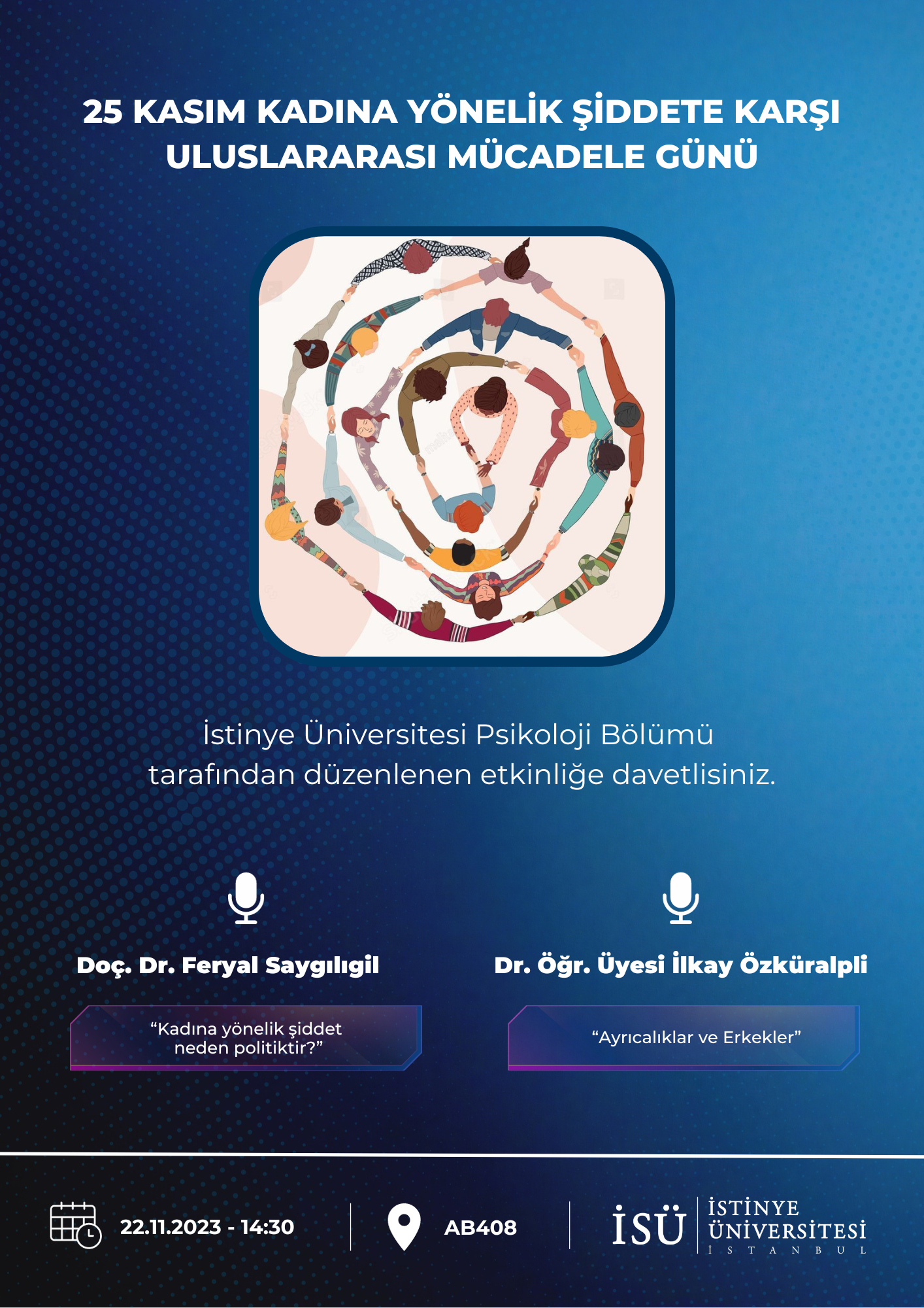 İstinye Üniversitesi İnsan ve Toplum Bilimleri Fakültesi, Psikoloji Bölümü tarafından düzenlenen etkinlikte kadına yönelik şiddete dikkat çekildi. 25 Kasım Kadına Yönelik Şiddete Karşı Uluslararası Mücadele Günü münasebetiyle kadın hakları ve kadına şiddet konularının ele alındığı etkinlik 22 Kasım Çarşamba günü saat 14.30'da Vadi Kampüs AB blokta gerçekleştirildi. Doç. Dr. Feryal Saygılıgil ve Dr. Öğr. Üyesi İlkay Özküralpli etkinlikte konuşmacı olarak misafir edildi.